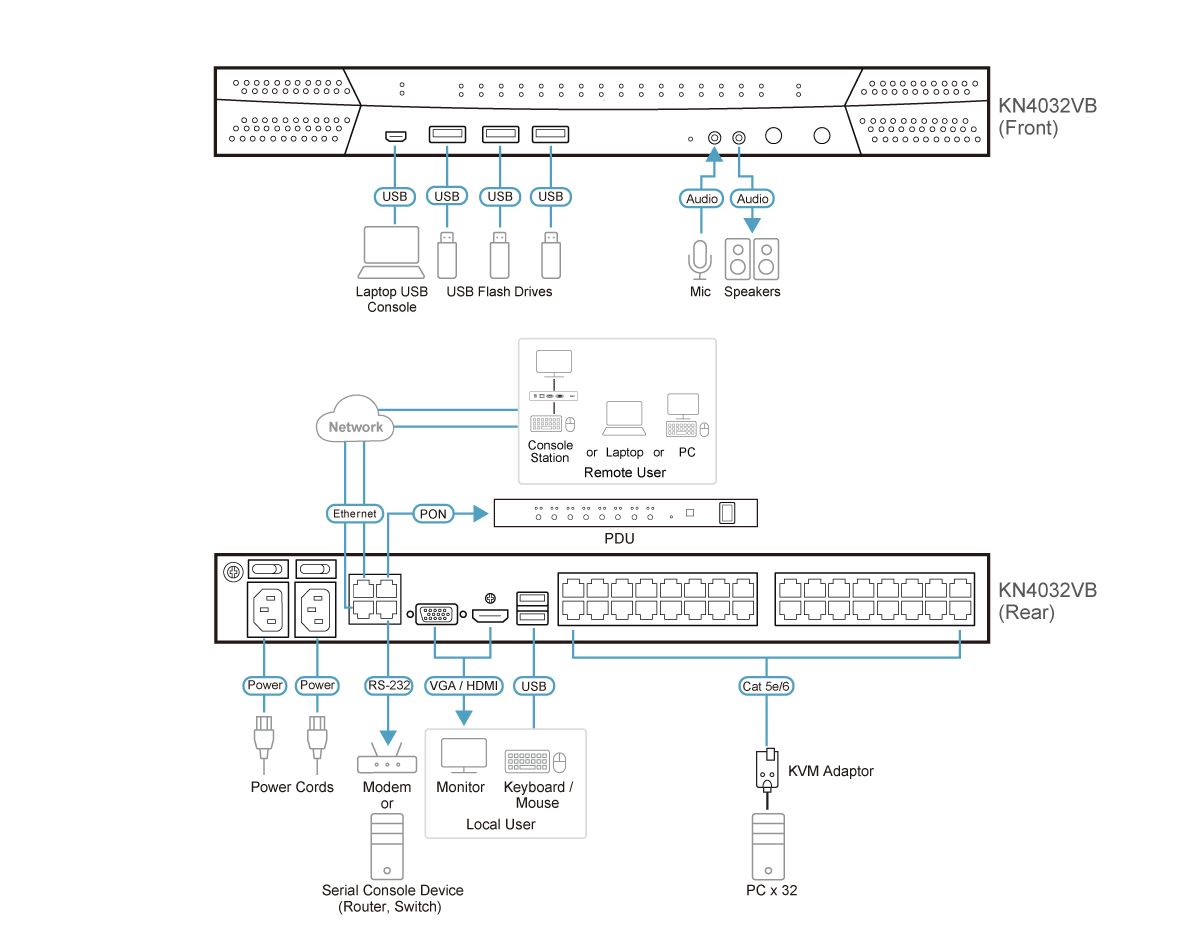 The KN series is compatible with ATEN’s KVM over IP Console Station – the KA82 series. The KA82 series is a standalone console that replaces PC or NB, enabling users to remotely access, monitor and control all servers connected to multiple ATEN’s KN series with impenetrable security against virus threats. It is especially suitable for environments where a PC is not allowed. In addition, the KN series works with ATEN’s PDU remote power management systems from the KVM over IP switches’ user interface.