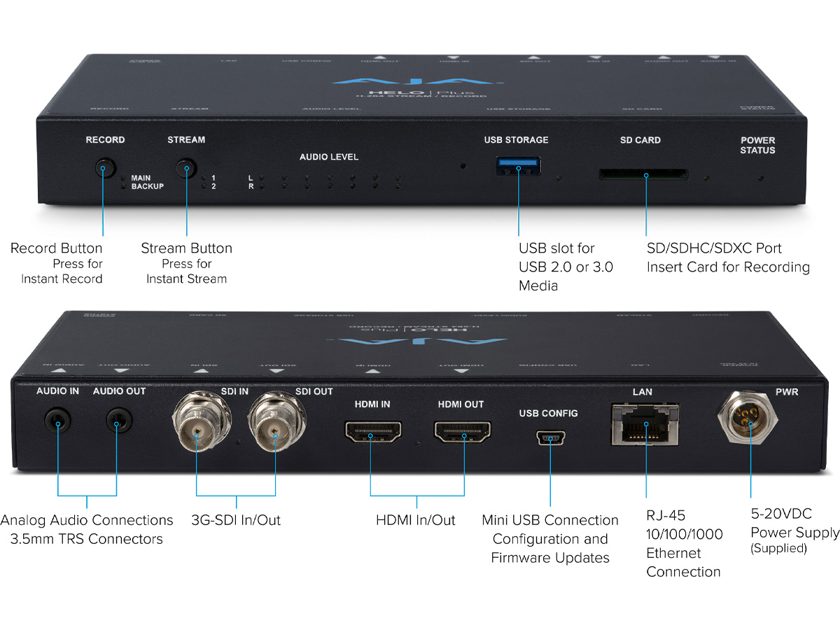 HELO Plus is a compact H.264 streaming and recording appliance designed to encode and deliver live video streams while creating local recordings. It supports up to 1080p60 capture and simultaneous streaming plus recording, enabling consistent delivery of live content. The unit is intended for operators who need a simple, independent encoder/recorder that integrates into broadcast and streaming workflows.