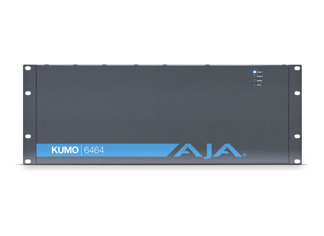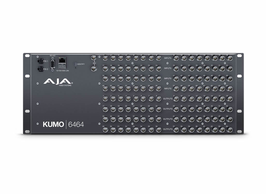 The KUMO 6464 Compact 64×64 3G-SDI Router from AJA offers 64 inputs and 64 outputs of 3G-SDI video and audio, while maintaining a slim and compact 4 RU profile. The router has elegant and powerful web-based network control, and supports any SDI-based signal up to 3G-SDI, including HD and even 4K/Ultra HD signals. Built with high-quality standards, the KUMO 6464 Router is ideal for any installation where a balance of size and routing capacity are critical.