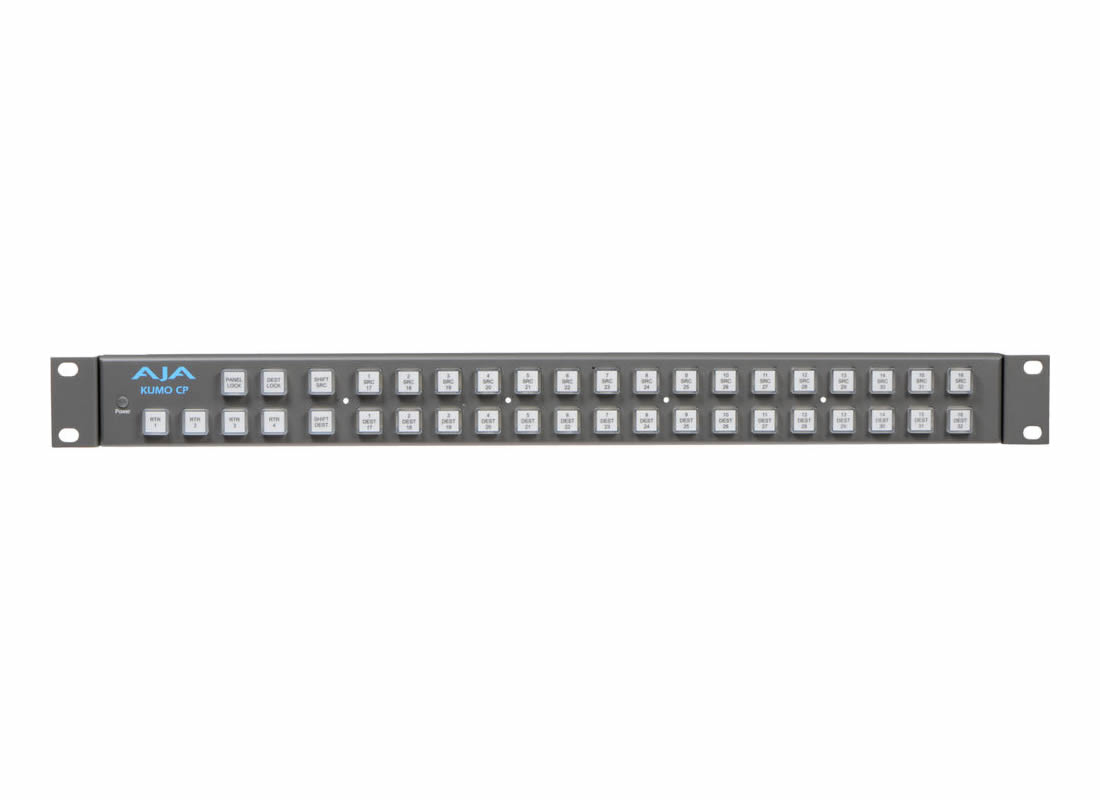 The KUMO CP features 40 buttons and enables selection of up to 32 sources and 32 destinations on each of up to four KUMO routers in standalone mode or through a built-in GUI accessible from any web browser on the network.
