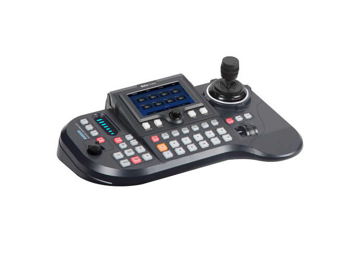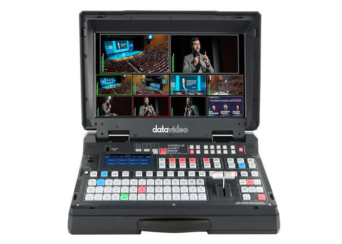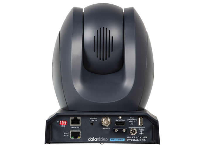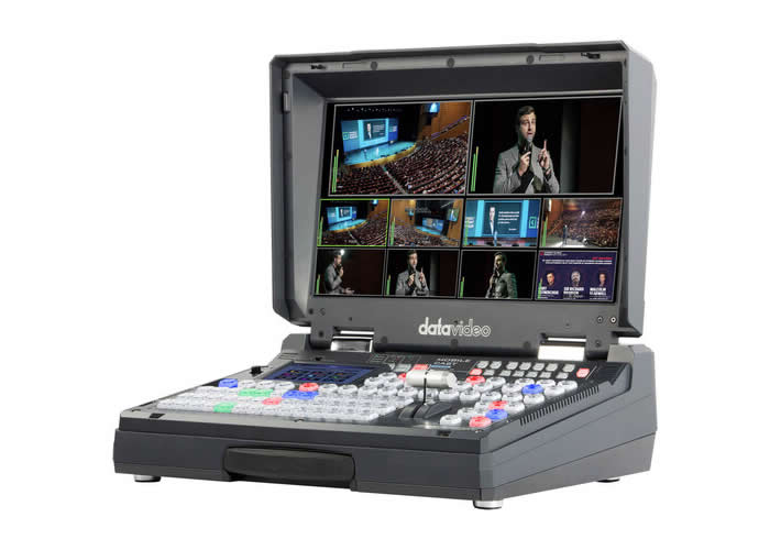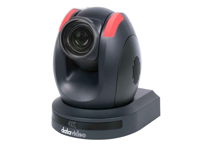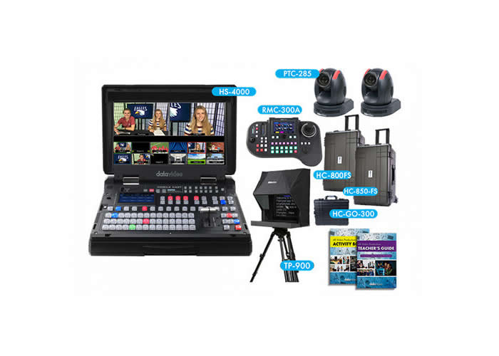 Performance is specified for UHD 4K at up to 60 frames per second and includes 10-bit broadcast-quality processing with per-input scaling and up-conversion. The package includes two Datavideo 4K HDMI/3G-SDI autotracking PTZ cameras with 12x optical zoom and 16x digital zoom, supporting UHD 2160p60 over HDMI/IP and 1080p60 over 3G-SDI. A professional audio delayer and four XLR inputs with two XLR outputs provide audio-to-video synchronization and balanced audio connections.