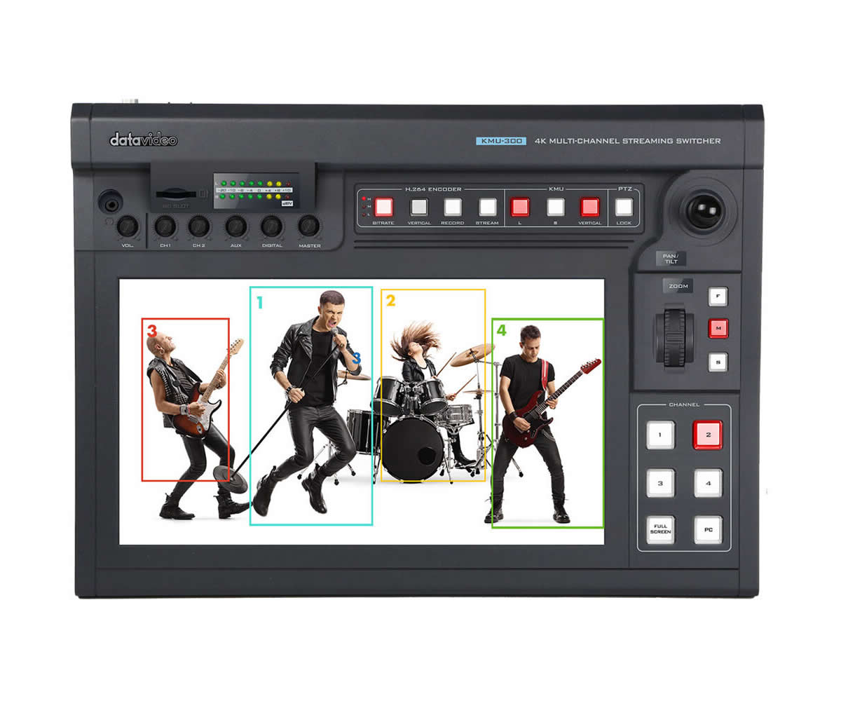 The KMU-300 is a portable 4K multicamera touchscreen switcher designed to centralize live production tasks including switching, streaming, recording and camera control. It accepts UHD 4K HDMI input and enables the operator to crop regions of interest on a 14 inch capacitive display to create multiple virtual camera angles. The unit is optimized for live broadcasts where a compact, all-in-one control surface is preferred.