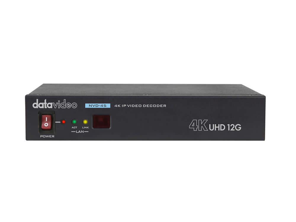 Decode streams from live platforms, popular CDNs, and from the dvCloud network with the NVD-45 UHD 4K Streaming IP Video Decoder with 12G-SDI Output from Datavideo. The NVD-45 decoder supports all common protocols like SRT, RTSP, RTMP, HLS, and MPEG-TS, and it outputs video at resolutions up to UHD 4K60. Video is output using one composite and two 12G-SDI outputs and audio is output via SDI embedding and stereo RCA ports.