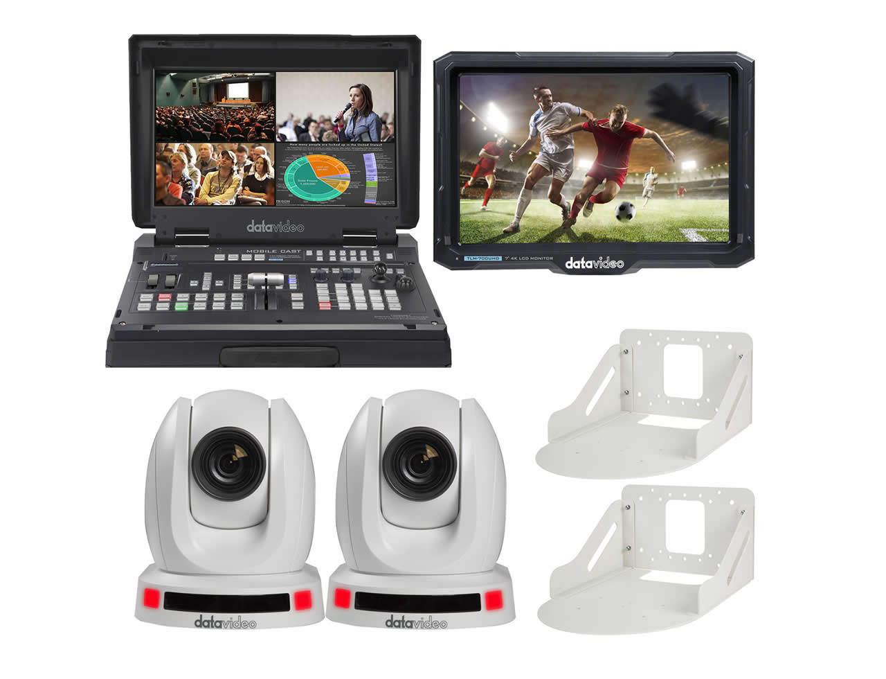 The EZ Streaming Package CW-AT by Datavideo is a streamlined solution for professional-grade streaming and recording. This package integrates two PTC-145T Auto Tracking HDBaseT PTZ cameras and a 7-inch 4K LCD monitor, designed to deliver high-quality video output with long-distance transmission capabilities.