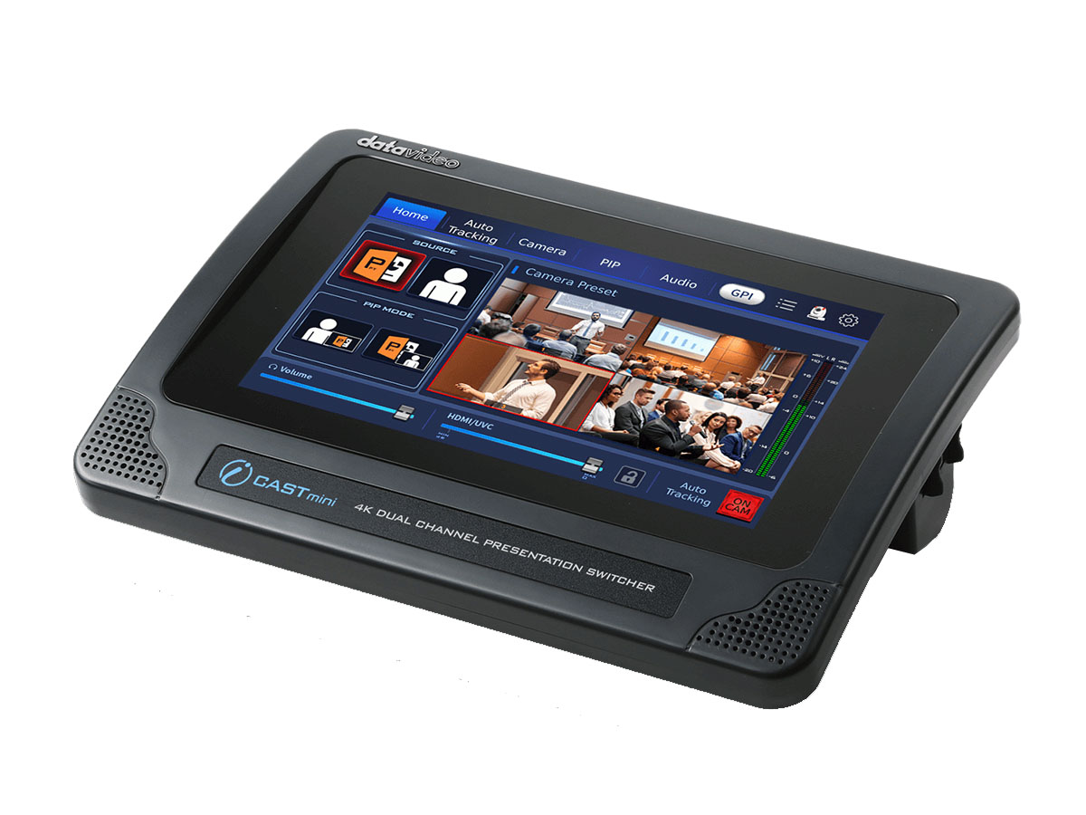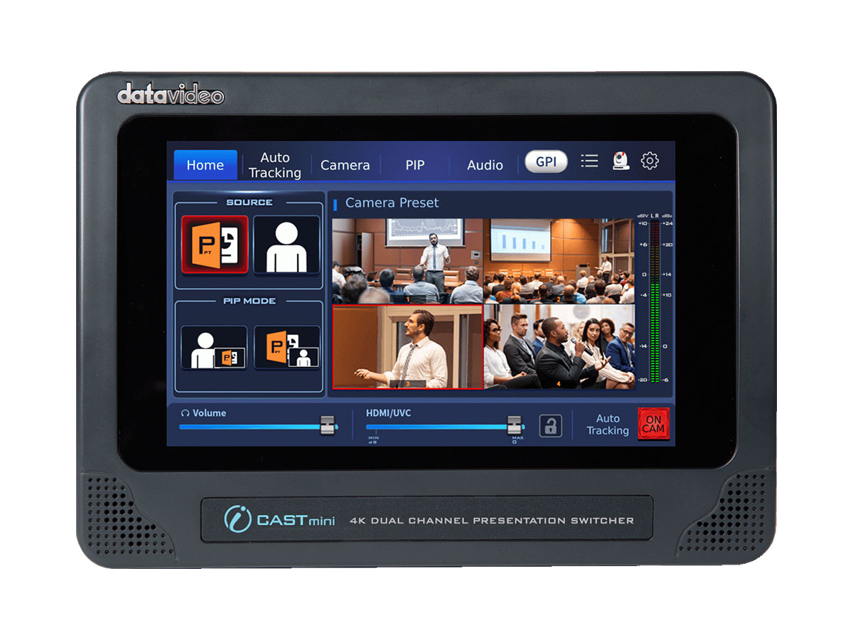 Typical applications include corporate training, hybrid classrooms, lecture capture and mid-size conference rooms where a single operator manages video switching and camera tracking. The iCAST mini is compatible with common conferencing platforms via UVC and integrates with Datavideo PTZ cameras for auto-tracking. Image key thumbnails and preloaded graphic icons speed up live switching and camera preset selection.