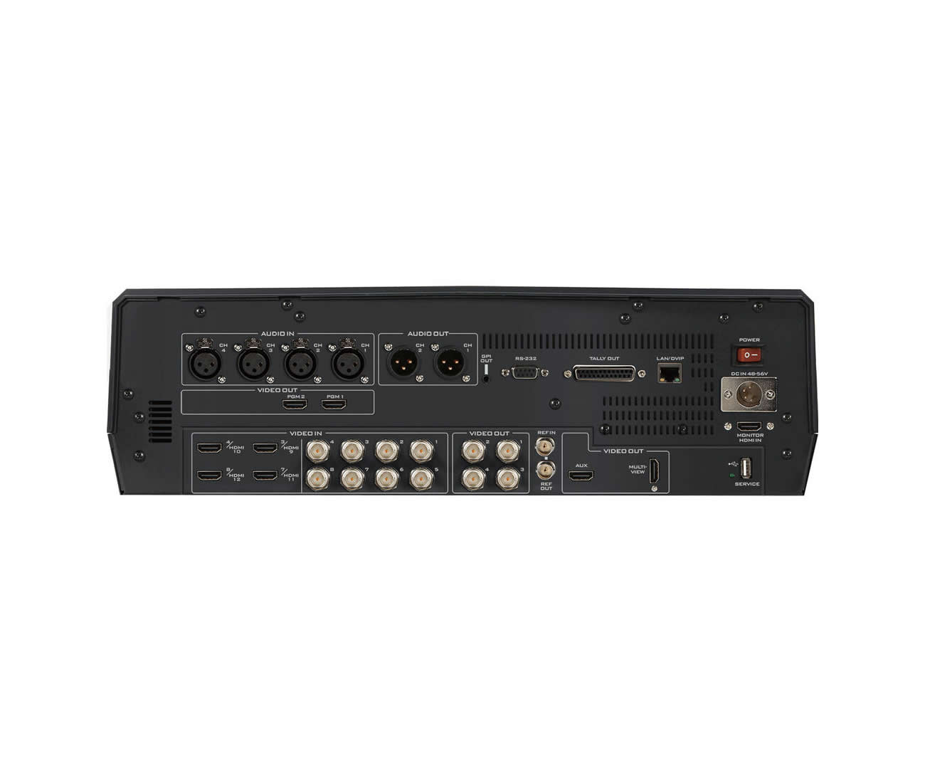 The unit accepts twelve video inputs with eight selectable active inputs, including eight SDI and four HDMI 2.0 ports and supports 10-bit broadcast-quality video. It offers four 12G-SDI outputs plus two HDMI program outputs and one HDMI multiview output for program feeds and monitoring. Built-in features include chroma/luma keying, downstream key (DSK), two PIP windows, 64 wipe transitions, logo insertion and still-store recall.