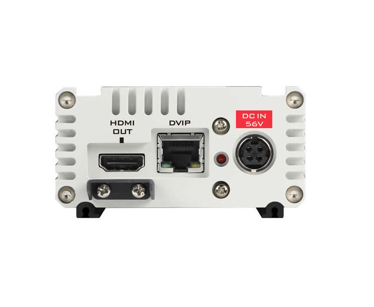 For connectivity the camera supports HDBaseT output to the included HBT-12 receiver carrying video, power and control over a single Cat cable to distances of up to 328 ft over Cat 6. The HBT-12 receiver accepts HDBaseT RJ45 and provides HDMI output and RS-422/-232 control passthrough, with PoE support and transmission capability up to 393.7 ft under HDBaseT specifications. The camera also offers LAN streaming via RJ45, SDI and HDMI outputs, plus a 3.5 mm stereo line input for external audio.