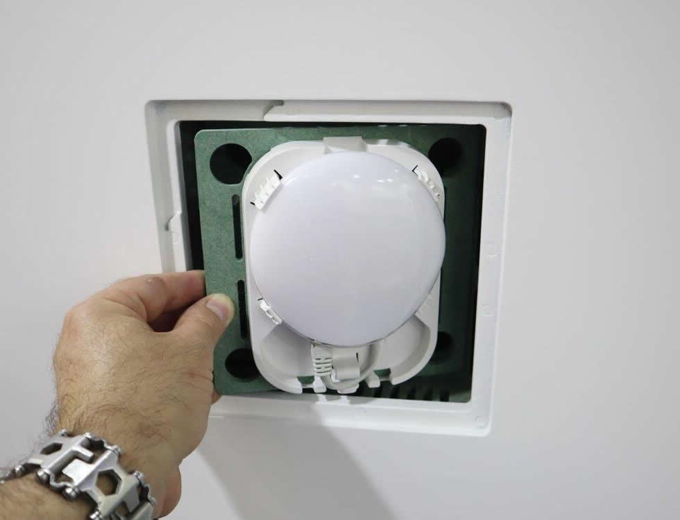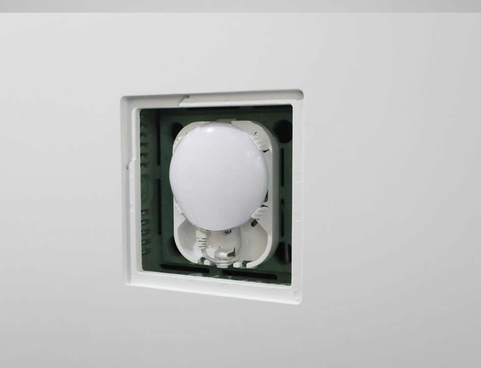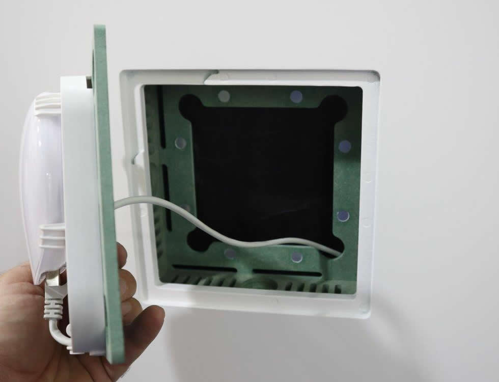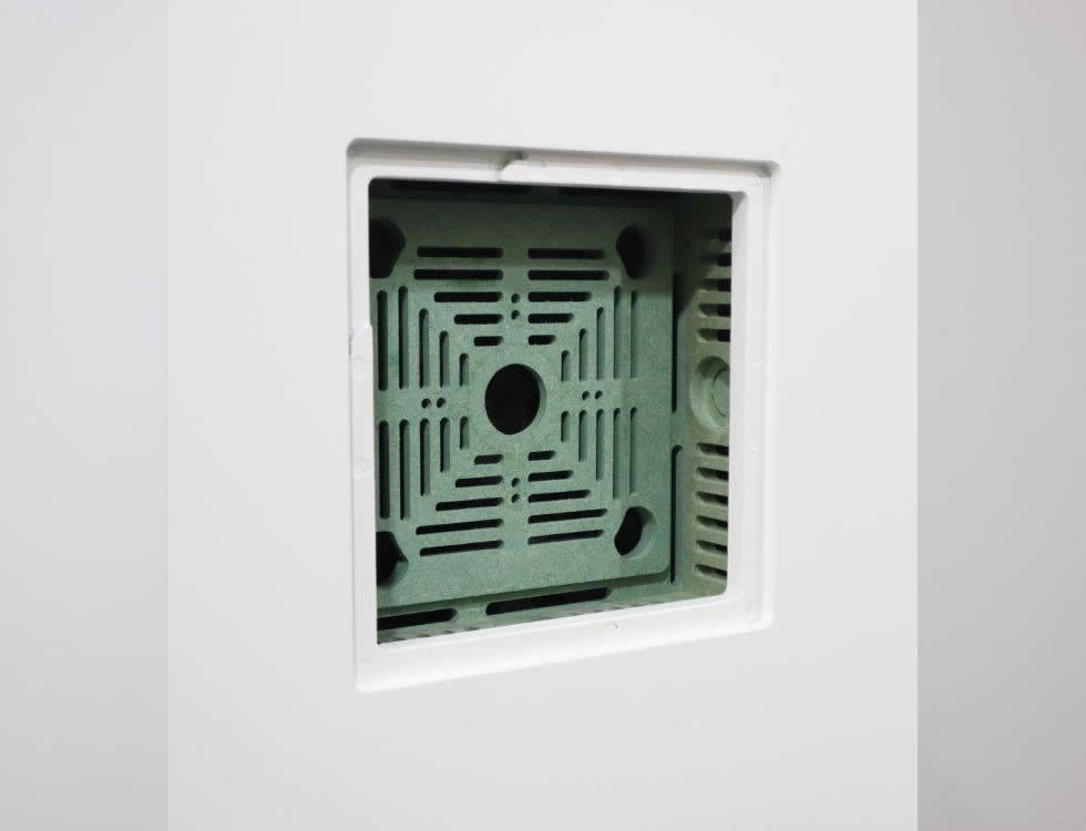Key features include a paintable moisture-resistant MDF construction, a removable device adapter and cover, and support for conduit connector installation. The unit permits easy insertion and removal of the device for maintenance or upgrades. Its flush design preserves a clean aesthetic and minimizes protrusion from the wall surface.