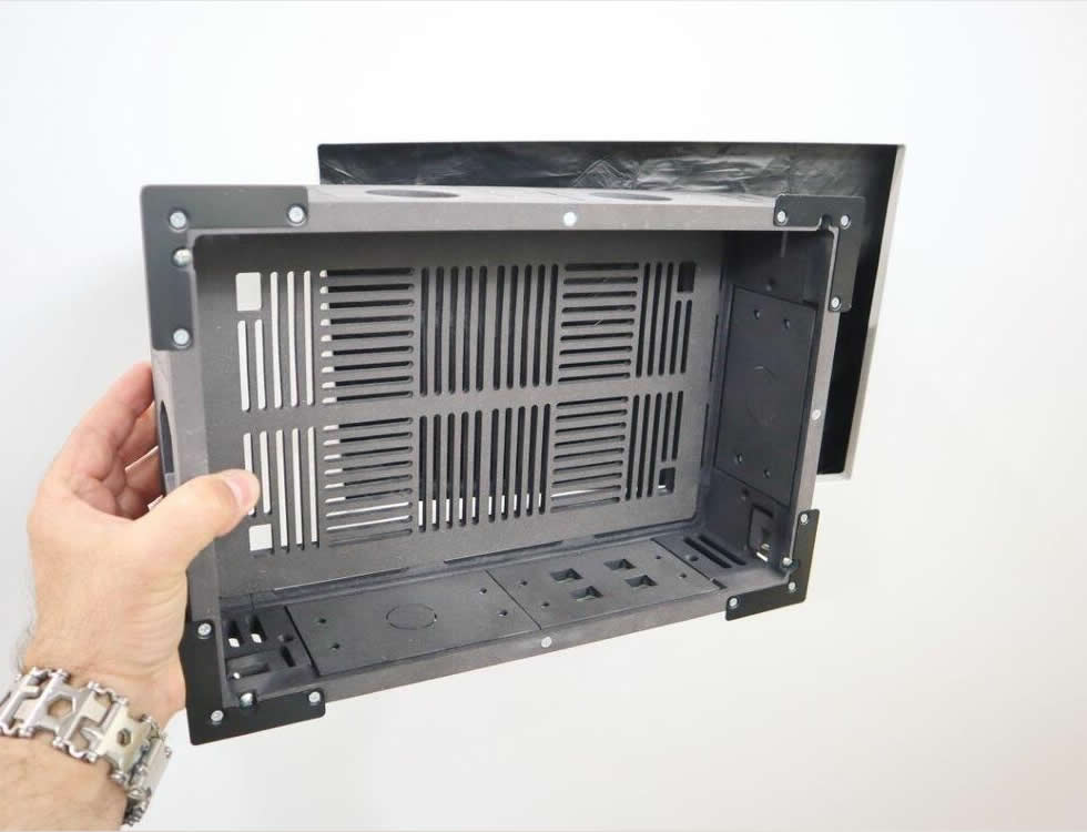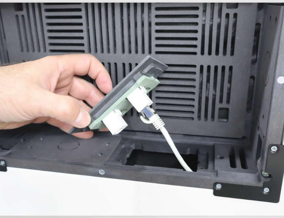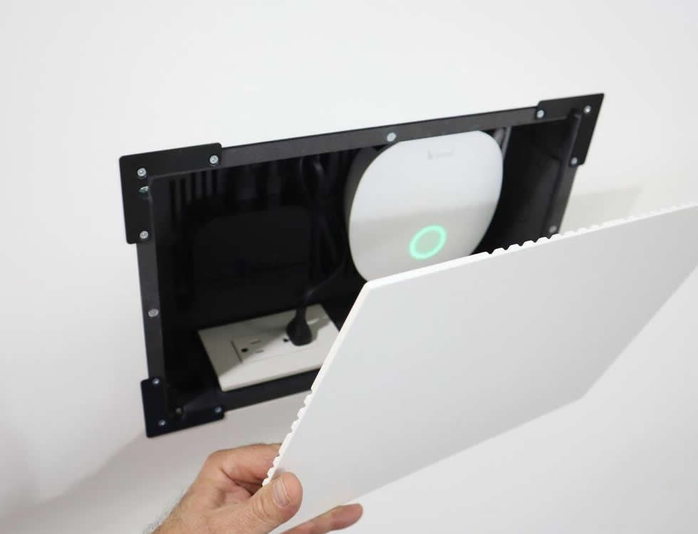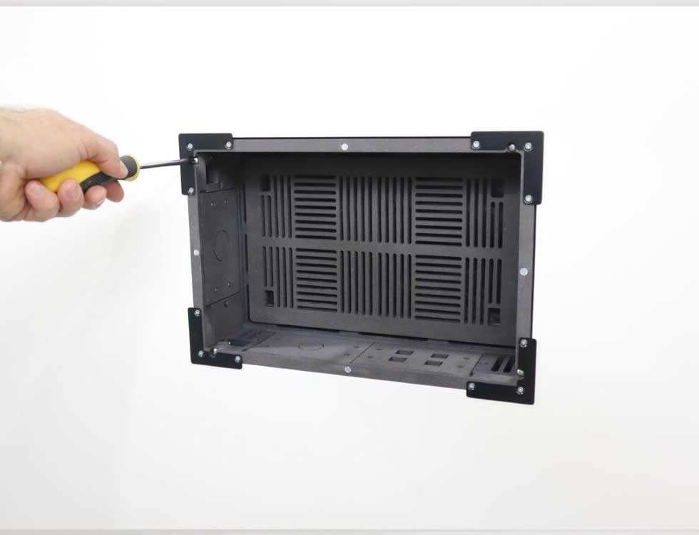 Installation is straightforward for experienced AV installers – the kit includes adapters, screws and interchangeable plates to match common conduit and keystone needs. The painted cover and integrated ventilation grilles reduce onsite finishing work while maintaining airflow. Overall the Retrofit Uni-INwall M provides a compact, serviceable in-wall mounting solution that improves appearance and access for mounted AV devices.