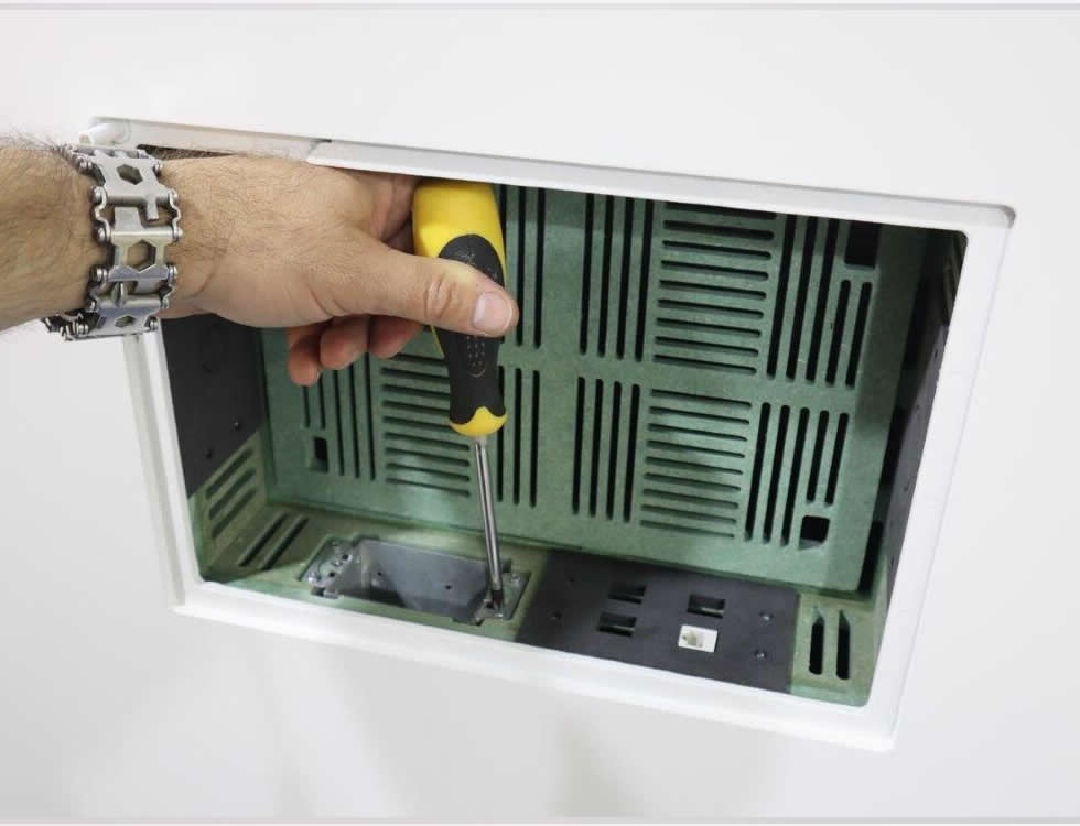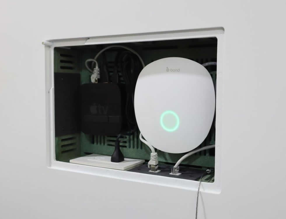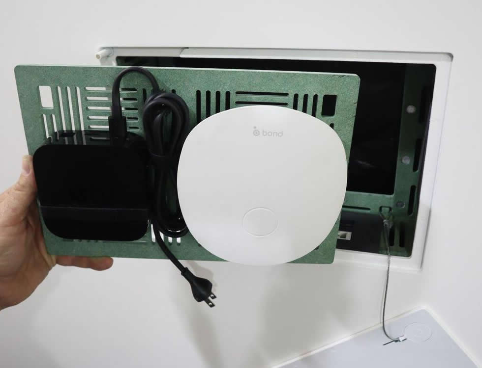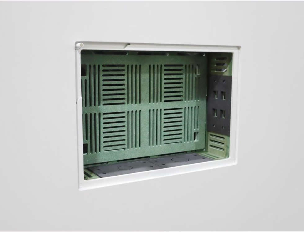 Installation is straightforward for contractors and AV technicians and is intended for 1/2 in drywall; a shim pack is available for 5/8 in drywall. The design emphasizes secure device retention, paintable finish for seamless integration and modular side plates for flexible cable management. The result is a clean, serviceable in-wall installation that reduces trim and housing clutter.