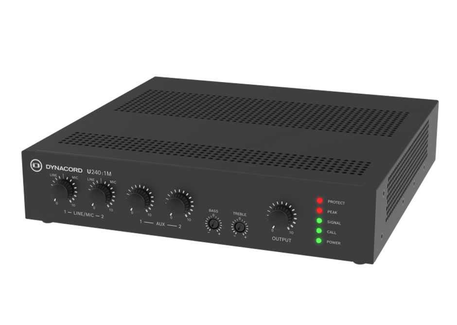 The U240:1M is a 240 W single-channel mixer amplifier designed for background music and clear voice announcements in small to medium installations. It combines a mixer section with a Class D power stage to deliver efficient amplification and controlled audio performance. Compact half-rack form factor and multiple mounting options make it suitable for constrained equipment spaces.