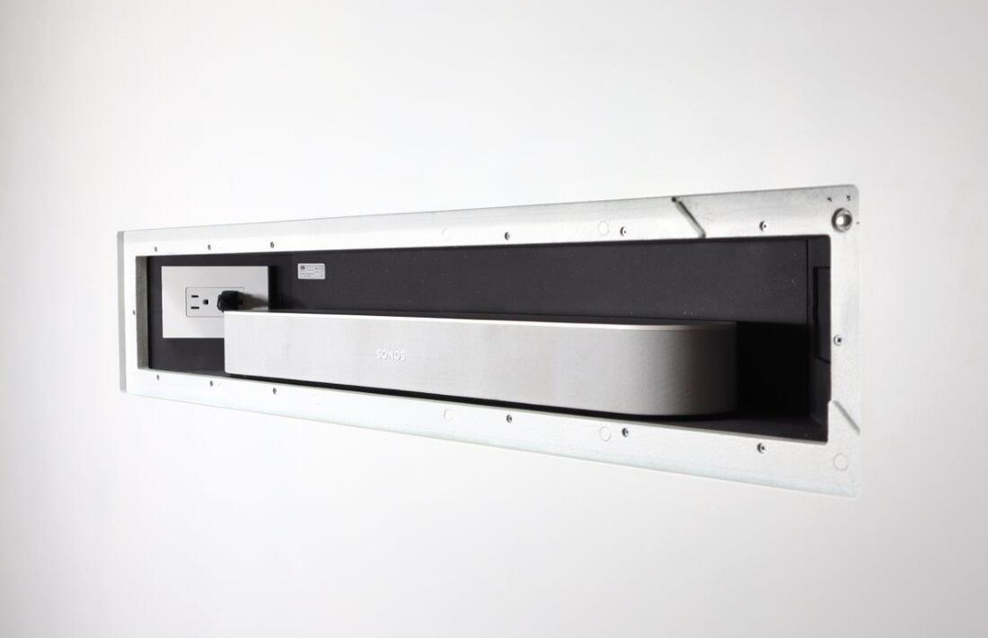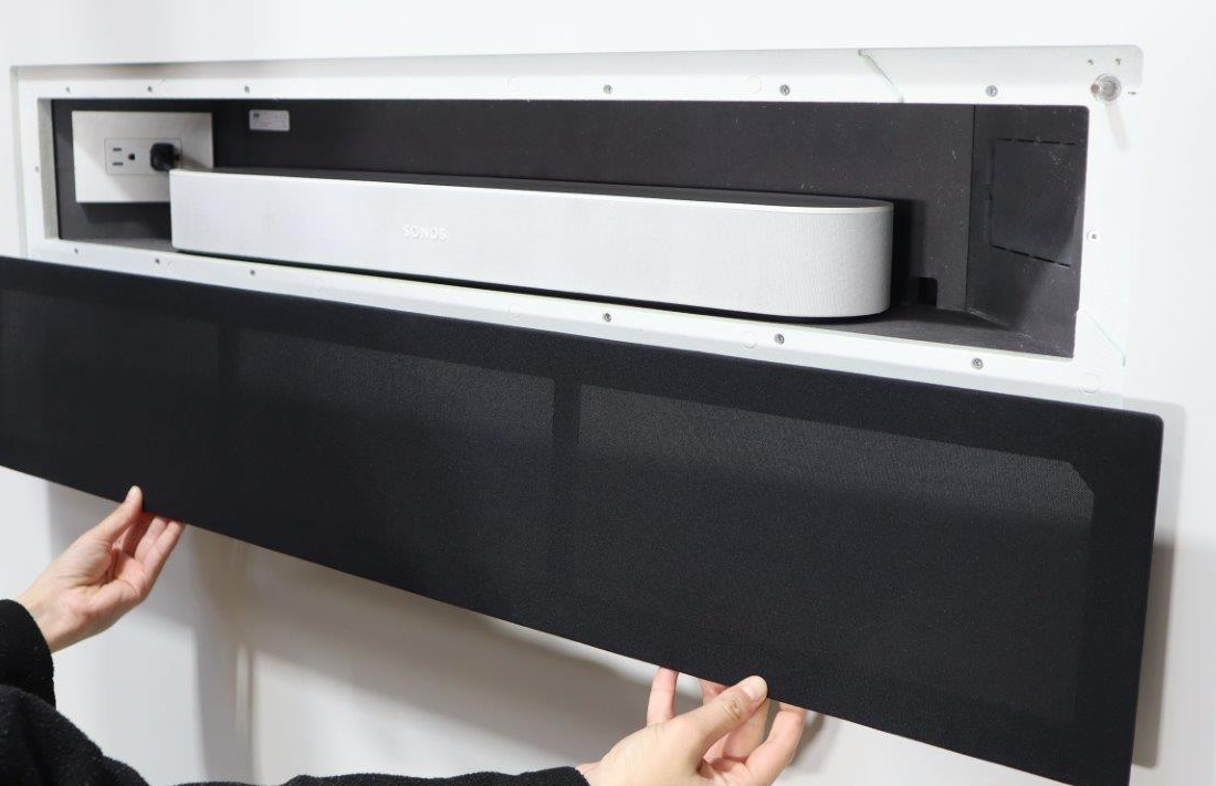 The WS in-wall mount is an adapter designed to provide a nearly flush installation for Beam series soundbars while preserving access and operation. It conceals the soundbar behind an acoustic grille that remains removable for service or adjustments. This solution focuses on clean aesthetics and unobtrusive integration into finished walls.