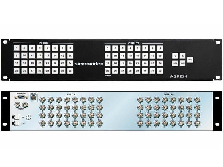 The Sierra Video Aspen 3232HD-3G Video Router is a 2RU rackmount routing switcher with 32 inputs and 32 SDI outputs which supports SD-SDI, HD-SDI, and HD-3G video signals. The Aspen 3232HD-3G has a front control panel with 64 routing control buttons and 5 control buttons. All buttons are multi-colored. The video router can be remotely controlled using an RS-232/422 serial interface or an Ethernet port by using the built-in web pages for configuration and operation. High signal integrity supporting cable runs of 155m at 2.97Gb/s Front control panel standard with multi-color buttons Front panel lockout Built-in GUI for configuration and operation via Ethernet, including Names, Salvos, Layers Output reclockers, Input equalizers External audio router control support (layers)