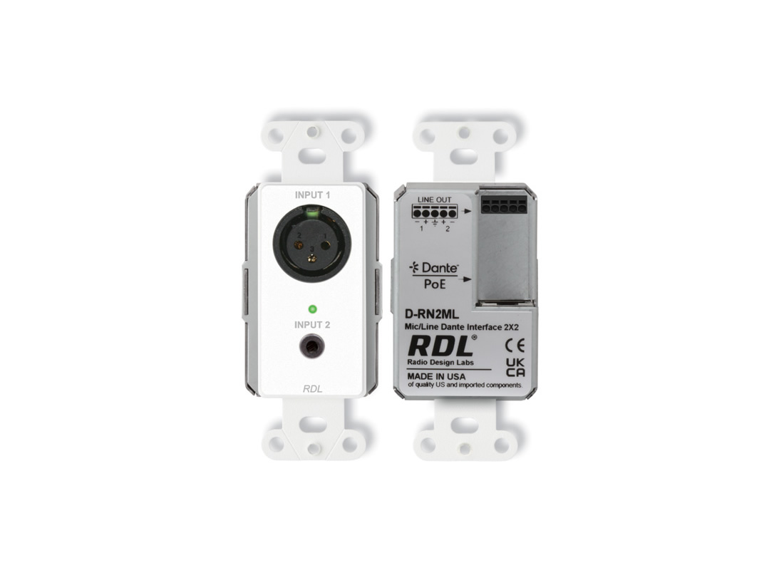 The D-RN2ML is a wall-mounted bi-directional Dante/AES67 audio network interface that converts mic and line sources to network audio and returns two network channels to balanced line outputs. It is designed for fixed installations requiring networked audio I/O in a single-gang footprint. The unit is PoE powered and supports 24-bit conversion for transparent audio performance.