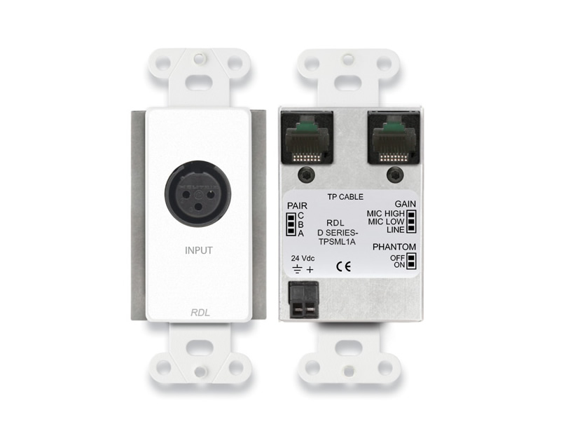 The D-TPSML1A is an active single-pair Format-A sender that accepts a balanced XLR microphone or line-level input. It provides a studio-quality preamplifier optimized for microphone and line operating levels. Designed for Format-A twisted-pair audio systems, the module sends one preamplified audio pair over an RJ45 connection.