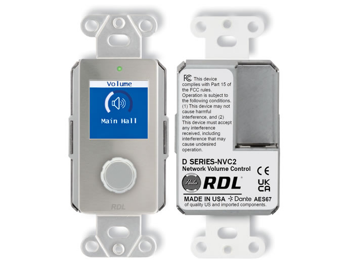 The D SERIES-NVC2 is a networked rotary volume control designed to provide precise level control and muting of one or two Dante/AES67 audio channels. It is a PoE powered wall-mount controller that displays status and level on a full-color LCD. The unit performs digital attenuation on network audio streams that pass through it – delivering consistent, repeatable adjustments.
