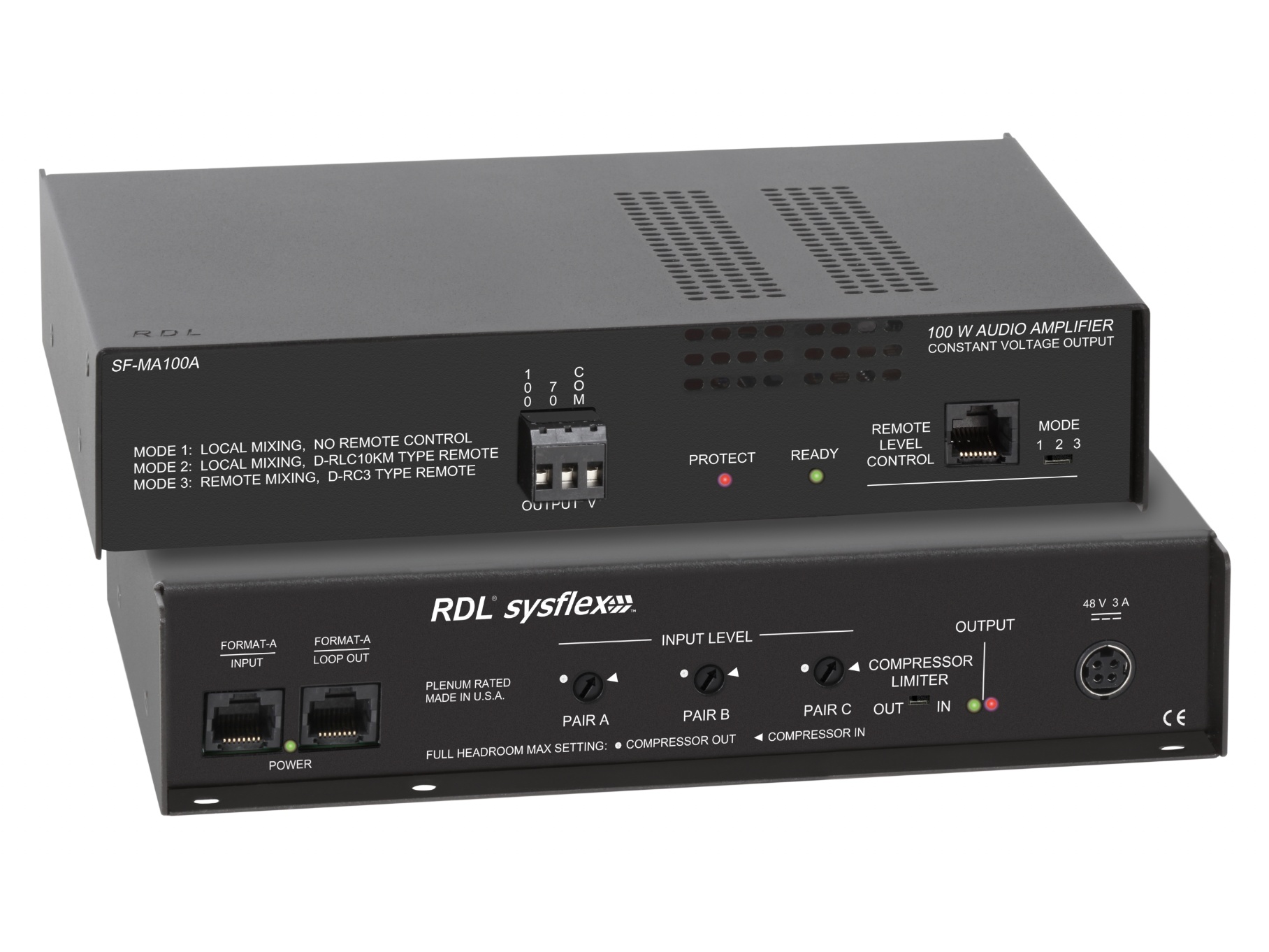 The SF-MA100A is a 100 watt constant-voltage mono mixer-amplifier that accepts three Format-A audio inputs and provides a 70 V or 100 V output. It mixes the three Format-A pairs locally or via remote VCA control and passes Format-A signal and power pairs through to a loop-out jack. The unit is engineered for continuous duty in demanding installations and includes a 48 Vdc module power supply.