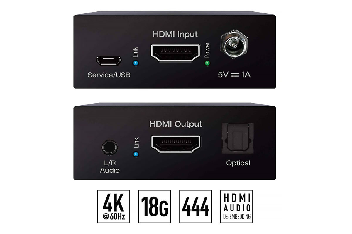 Connectivity covers a single HDMI input and output, micro-USB service port, and both analog 3.5mm and optical S/PDIF audio outputs. ARC and CEC passthrough are supported when connected to compatible displays and sources. The unit integrates into distributed audio or AV installations and interfaces with legacy displays using its down-conversion feature.