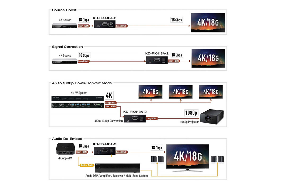 The KD-FIX418A-3 is a 4K/18G HDMI fixer and booster designed to resolve common HDMI integration issues and maintain reliable signal delivery. It stabilizes HDMI handshakes, manages HDCP authentication, and regenerates TMDS to recover degraded signals. The unit also de-embeds audio for connection to audio DSPs, amplifiers, and sound bars.