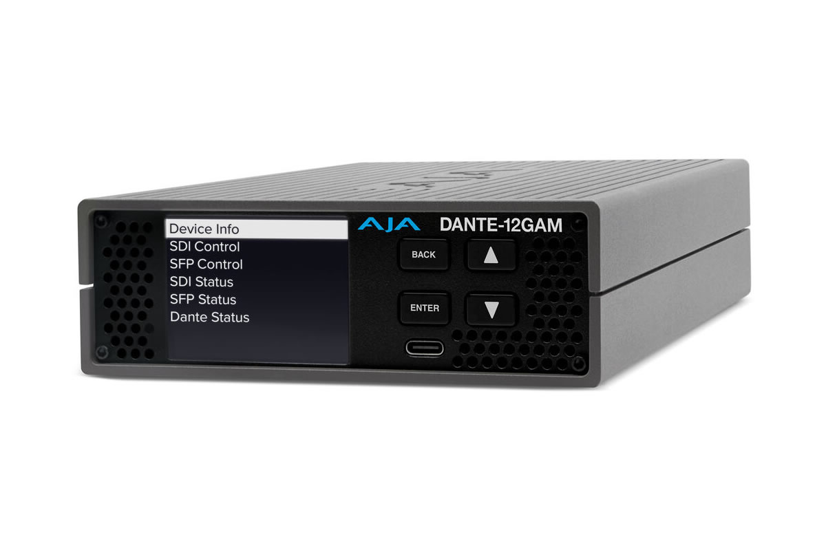 The DANTE-12GAM is housed in a compact rugged aluminum chassis with front-to-back active cooling and an LCD for status. Setup is streamlined via front-panel buttons or the integrated web UI, and the unit accepts AC or DC power and supports PoE for flexible installations. Firmware updates and network configuration are handled through the web UI or Dante Controller for repeatable deployments.