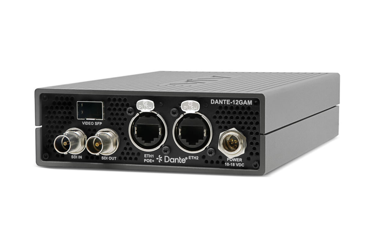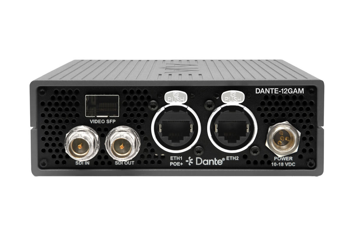 The DANTE-12GAM is an SDI audio bridge that connects embedded audio in 12G-SDI video to Dante IP audio networks and back. It performs 32 channels of simultaneous embed and de-embed across a single 12G-SDI link and a Dante network. The unit supports modern broadcast resolutions and provides integrated signal generators for standalone operation.
