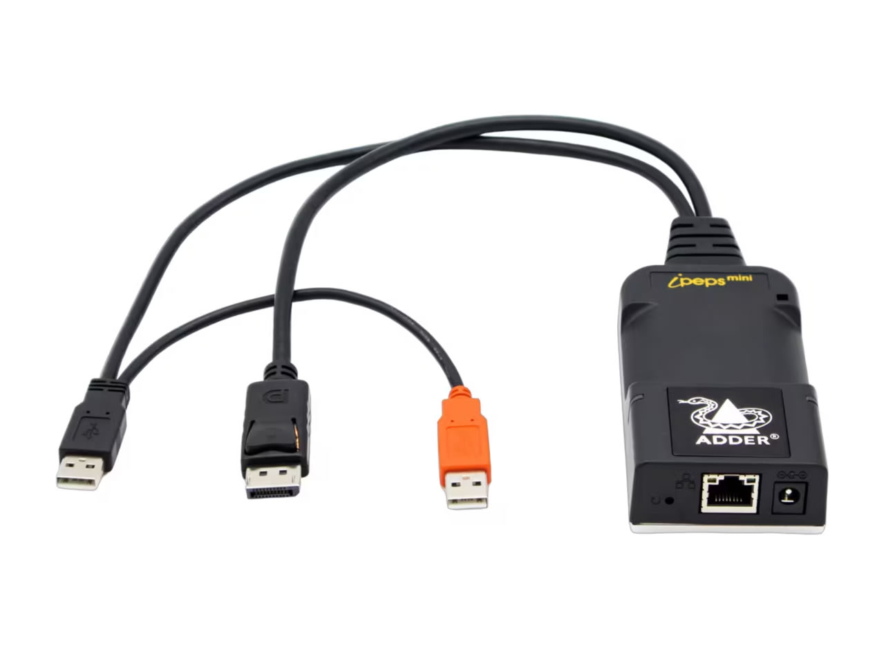 The ADDERLink ipeps mini is a compact standalone KVM over IP endpoint designed to provide secure remote access to a single DisplayPort-equipped host. It enables full keyboard, video and mouse control from anywhere via an IP network using the RealVNC client. The unit operates independently of the host operating system so administrators retain control during BIOS, boot or crash states.