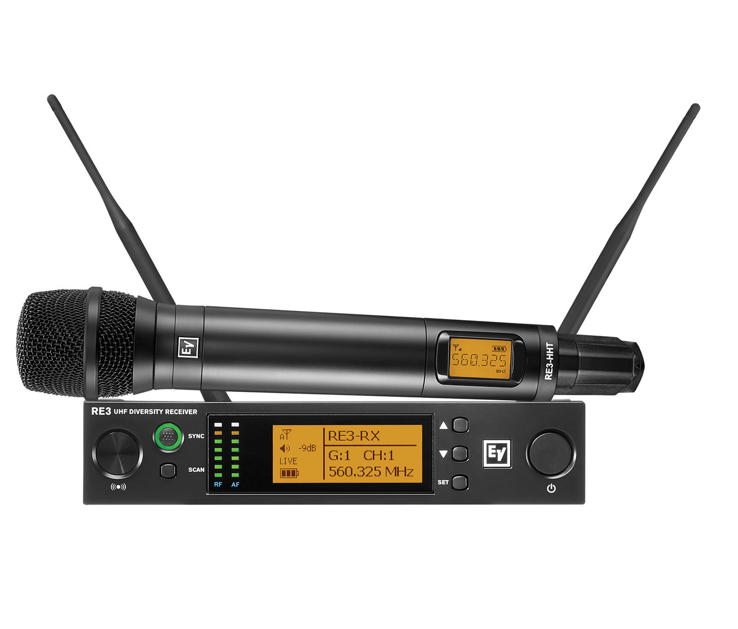 The Electro-Voice RE3-RE420 is a UHF wireless handheld microphone system designed to provide exceptional audio quality for a variety of applications. This system includes a rack-mountable diversity receiver and a handheld transmitter equipped with the RE420 cardioid condenser microphone capsule, ensuring clear and reliable voice reproduction.