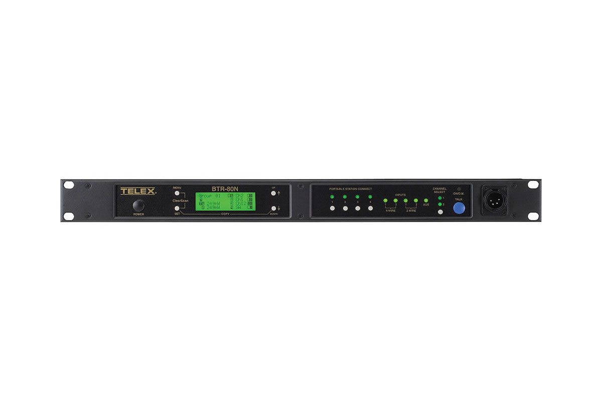 The BTR-80N is a 2-channel UHF wireless intercom base station designed to provide clear, full-duplex crew communications in congested RF environments. It offers frequency agility across selectable 18 MHz bands and supports simultaneous wireless access from multiple beltpacks. The base includes an integrated headset talk/listen station for on-site monitoring and control.