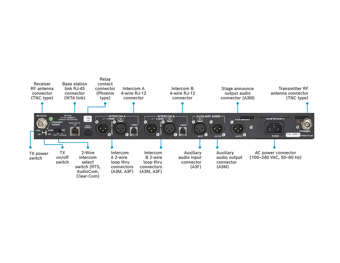 Connectivity includes adjustable 4-wire input and output levels, auxiliary balanced audio input and output, local headset output rated at 40 mW into 600 ohms, and a microphone input sensitivity listed in the product data. The base station uses a supplied 1/2 wave antenna with TNC male connectors for TX and RX and an IEC power inlet for AC mains connection. The BTR-800 integrates with Audiocom, RTS two-wire, Clear-Com and RTS digital matrix systems and other four-wire intercom environments.