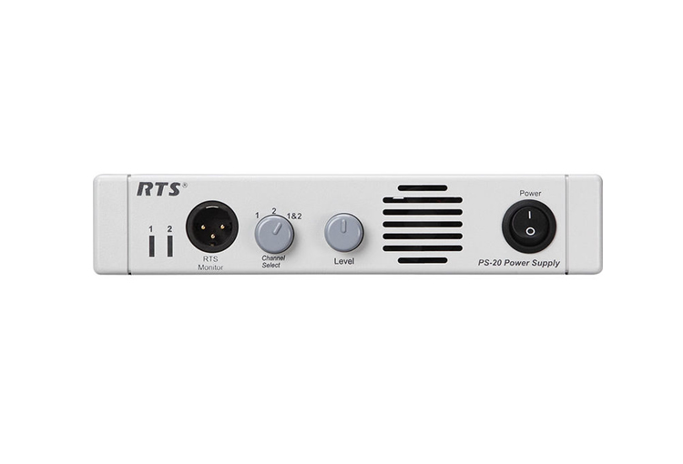 The PS-20 is a rackmount intercom power supply engineered to distribute DC and mixed audio to up to 25 stations. It provides dual-channel selection and front-panel monitoring to support multi-channel intercom systems. The chassis fits a standard 19 inch rack and is designed for installed broadcasting and AV environments.