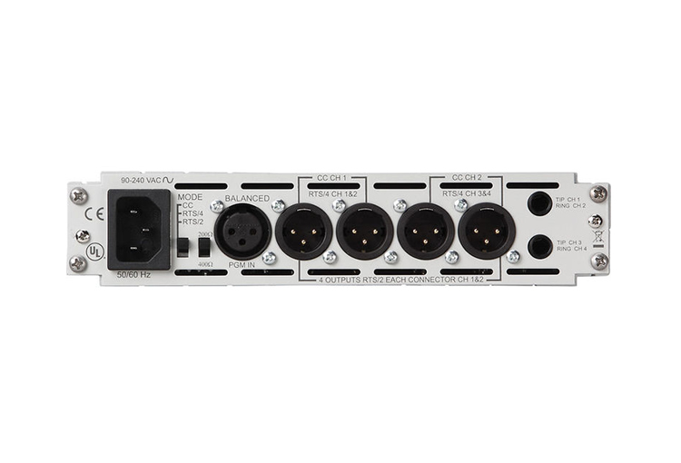 Connectivity includes XLR program input, XLR RTS main outputs, XLR RTS monitor output, and two 1/4" stereo phono jacks for audio linking. Rear-panel mode selectors support CC, RTS/2, and RTS/4 wiring schemes to ensure compatibility with common partyline intercom standards. The unit supports both balanced and unbalanced connections where required.