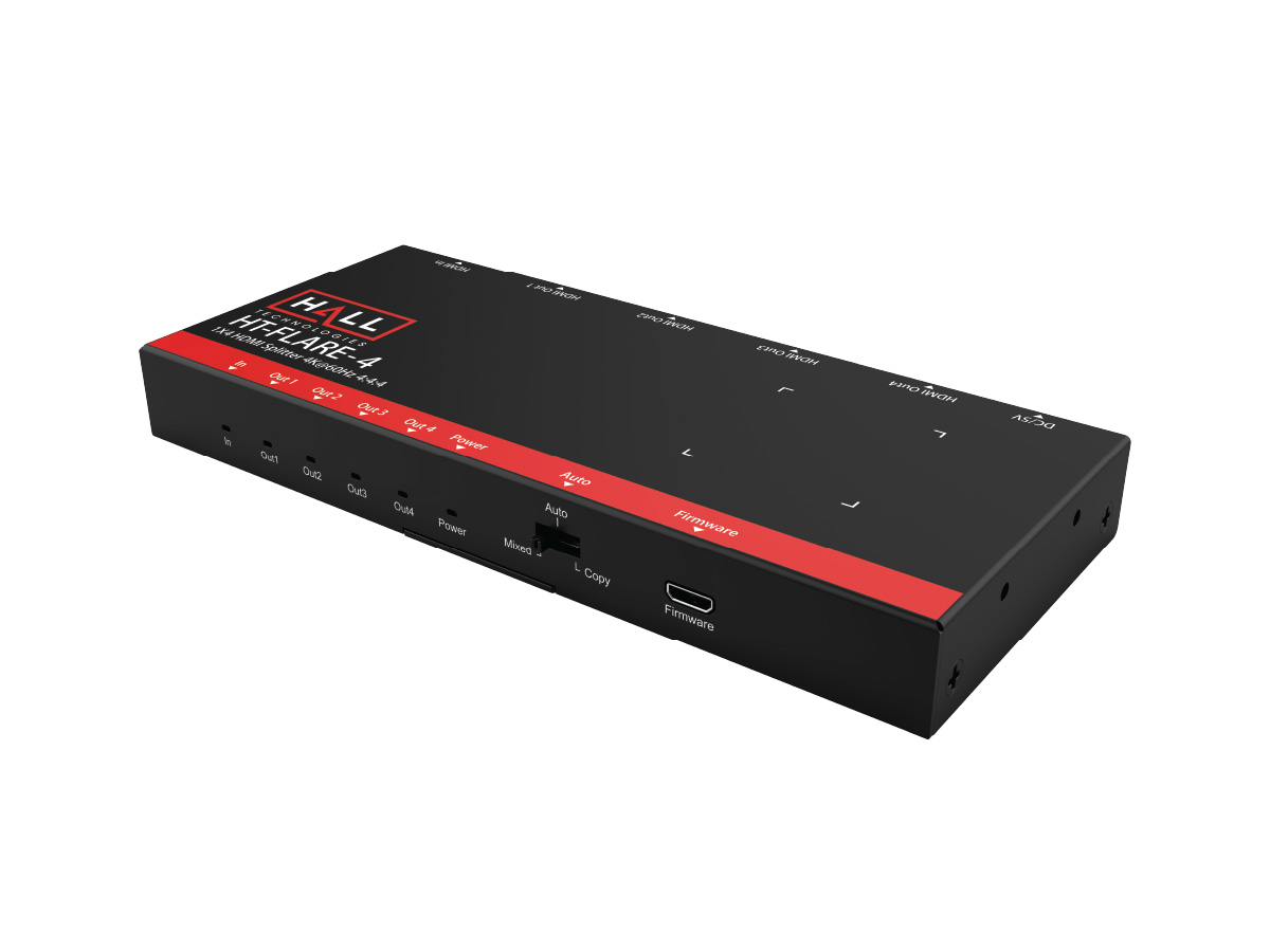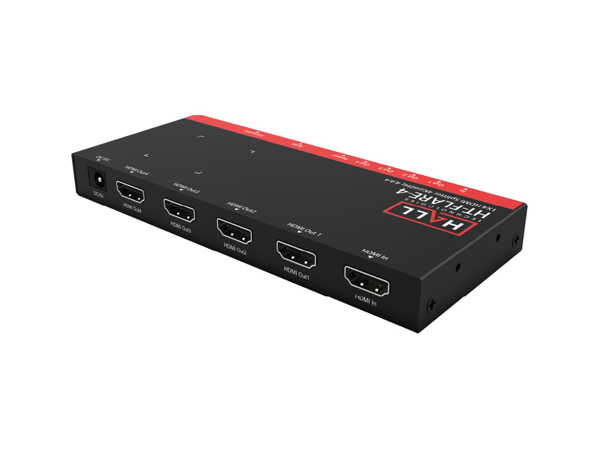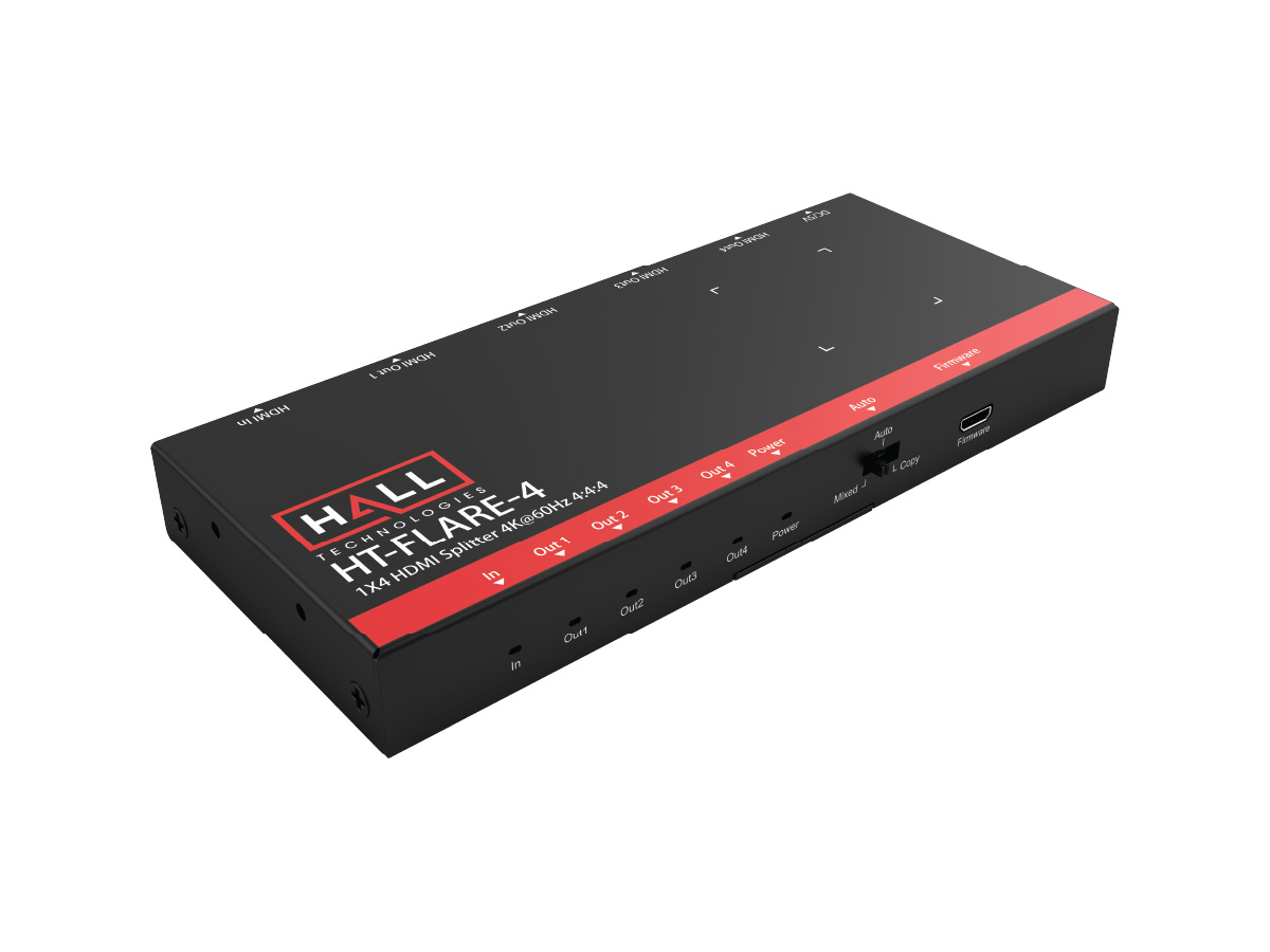 The HT-FLARE-4 is a 1×4 HDMI splitter designed to distribute a single HDMI source to up to four displays while preserving high-resolution video and multichannel audio. It supports resolutions up to 4K@60Hz 4:4:4 and full HDMI 2.0 bandwidth, enabling consistent picture quality across multiple screens. This unit also supports HDCP and HDR to maintain compatibility with modern source devices and displays.
