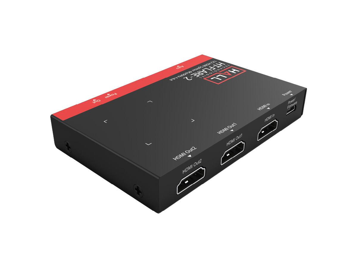 The HT-FLARE-2 is a 1×2 HDMI distribution amplifier designed to deliver a single HDMI source to two displays simultaneously. It supports resolutions up to 4K@60Hz 4:4:4 and preserves wide color gamut and high dynamic range content. The unit is intended for installations requiring reliable dual-output distribution without complex configuration.