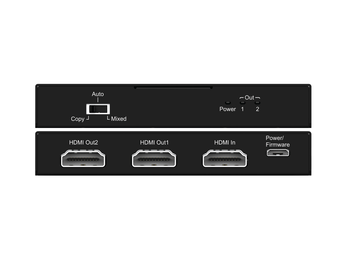Typical applications include digital signage systems, small commercial AV installations, and home theater setups where a single 4K source must feed two displays. It is useful for demonstration rooms, point-of-sale displays, and distributed presentation environments that require identical or mixed-resolution displays. The audio extraction options also allow feeding AV receivers or audio processors separately from video feeds.