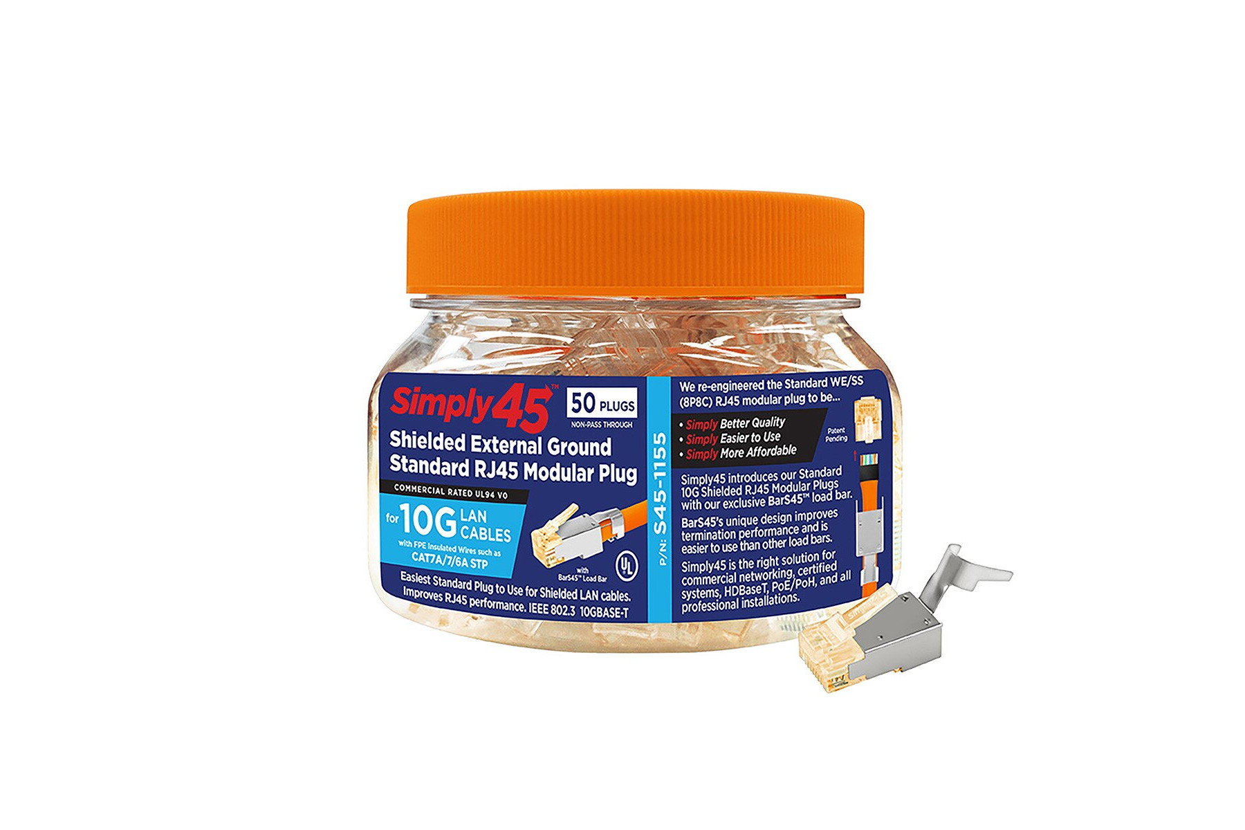 Standard Cat7a/7/6a Shielded External Ground RJ45 Modular Plugs with Bar45™ Orange Tint, Hi/Lo Stagger – 50pcs/Jar