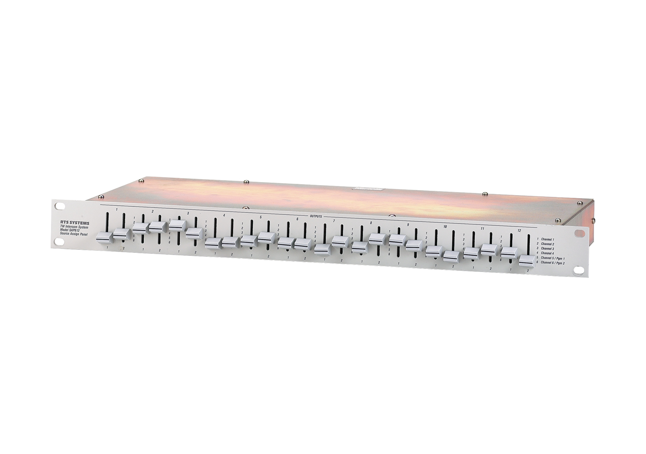 The panel supports flexible channel routing where any one of six intercom channels or two program channels can be assigned to any of the twelve outputs. Outputs provide two separate feeds per user string and use three-pin XLR male connectors for direct connection to individual stations or groups. Built-in switchable 200 ohm line terminations and transformer-isolated program inputs preserve audio integrity across connected stations.