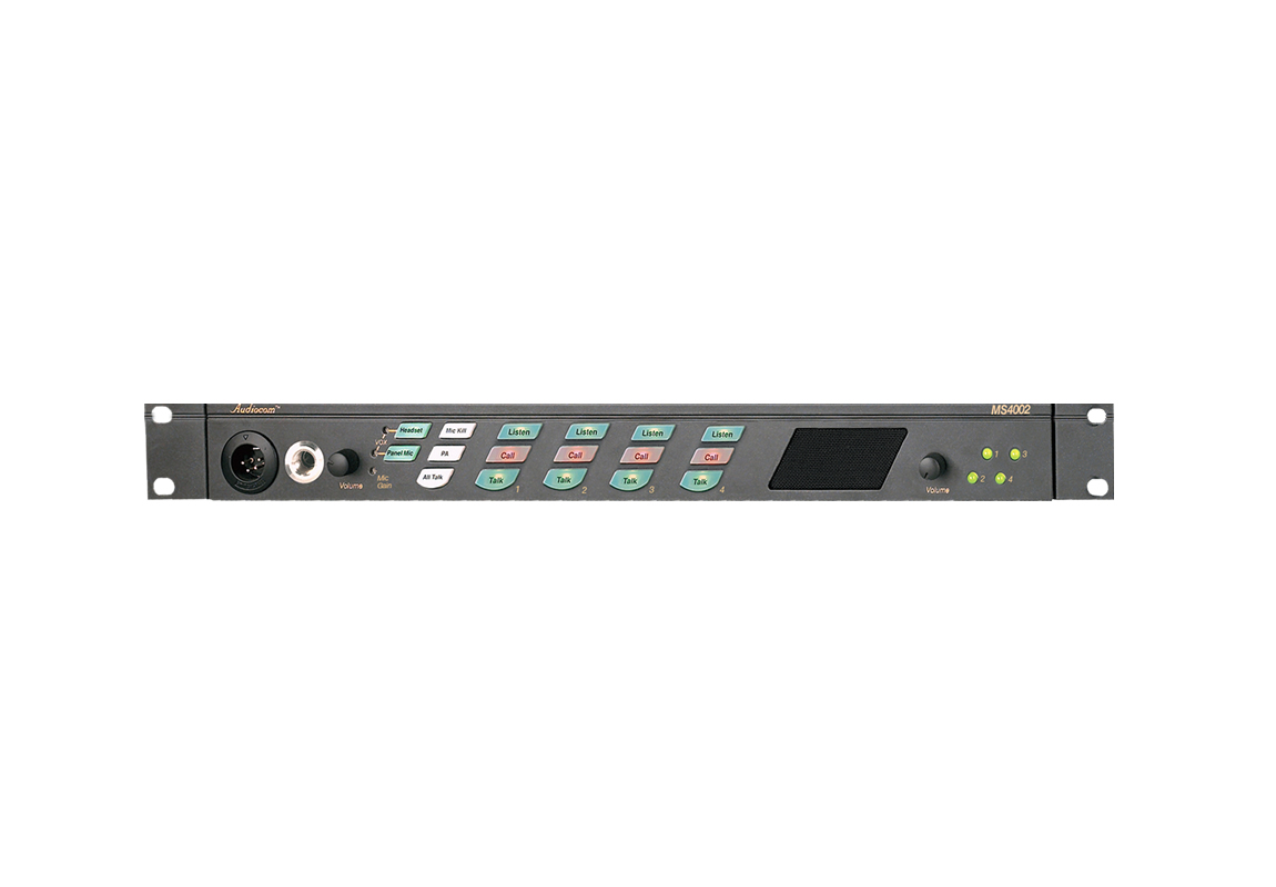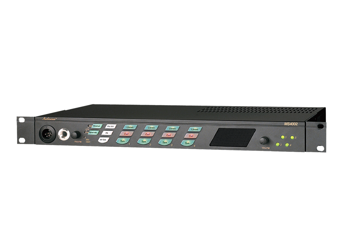 The MS-4002 is a four-channel balanced audio master station that integrates a 4.0 amp system power supply in a single 1U rack-mount chassis. It provides operator audio control for intercom networks and supports both speaker-station and headset-station operation. The unit is designed for professional AV and broadcast environments that require a compact, rackable master intercom solution.