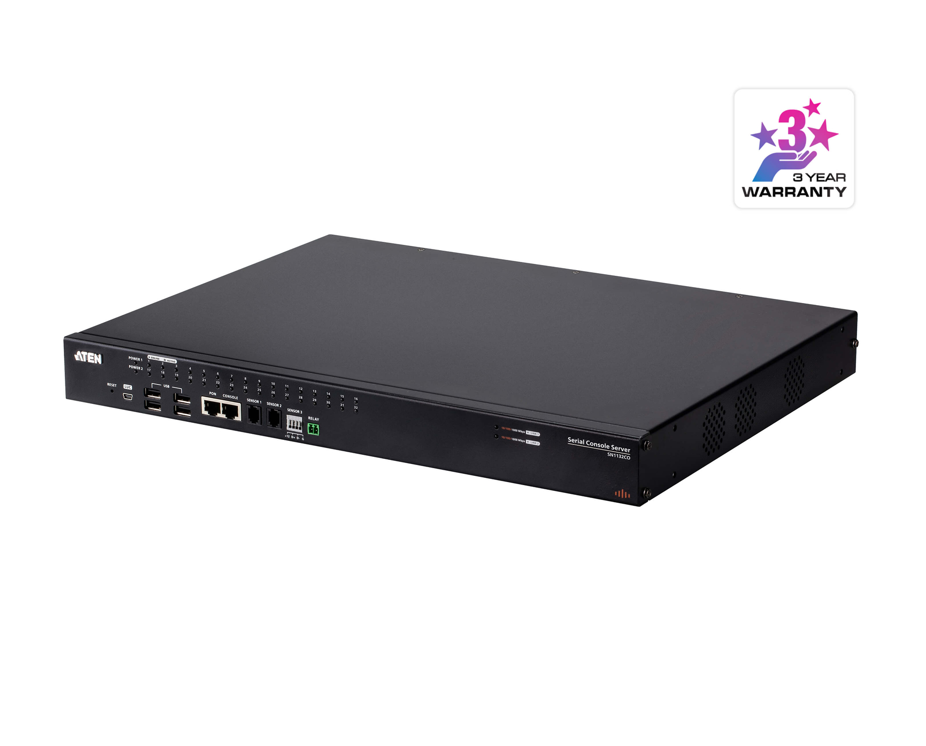 ATEN SN11xxCO Series (SN1116CO / SN1132CO / SN1148CO) serial console server provides IT and network administrators secure, out-of-band access to serial devices located at data centers or remote sites (such as network switches allowing console operation using RS-232 and USB console1). With dual power/SFP2 in the SN11xxCO models, all of them integrate cutting edge technologies to provide convenient installation, secure serial device access, easy management and comprehensive control for data centers.SN11xxCO series also supports USB 4G dongle3, for additional out-of-band network access.