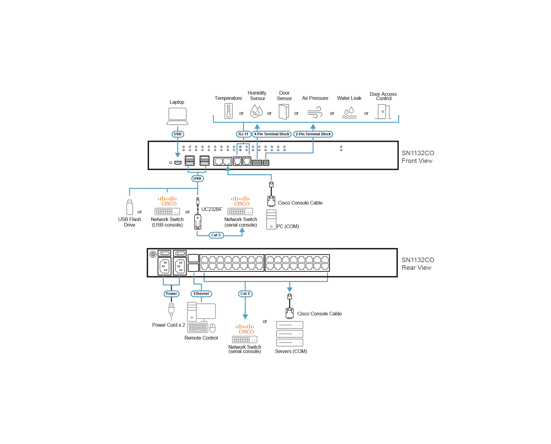 - Front USB ports for storage, USB console1, and UC232B / UC232BF connection