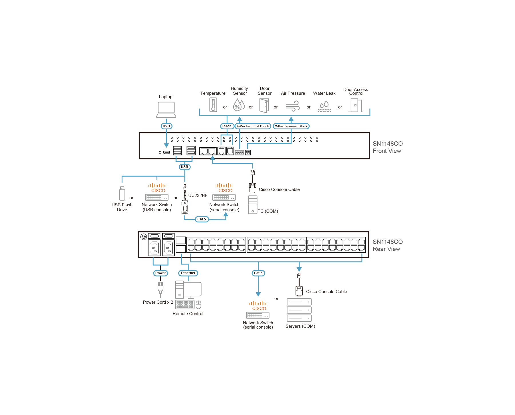 - Front USB ports for storage, USB console1, and UC232B/UC232BF connection