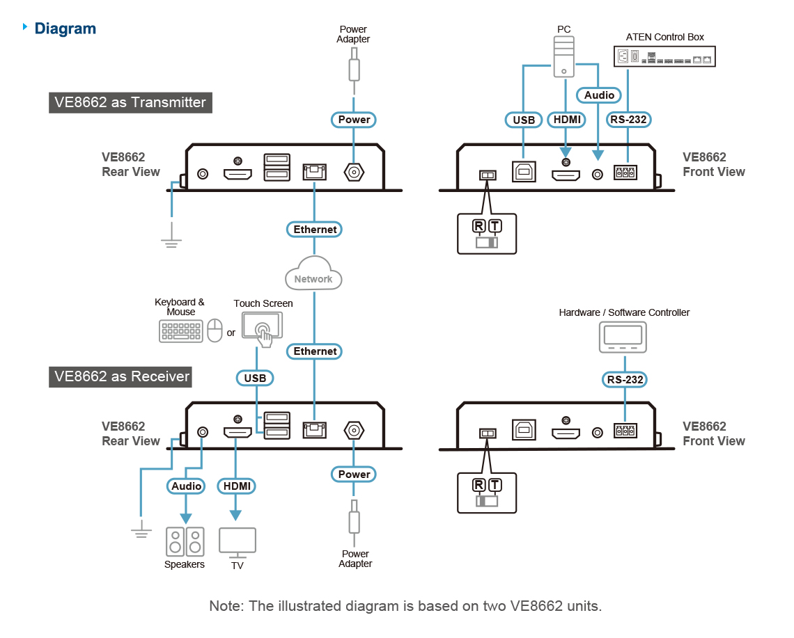 - Integrated solution compatible with ATEN Control System, allowing direct operation of VE8662 via CLI Telnet or RS-232 protocol
