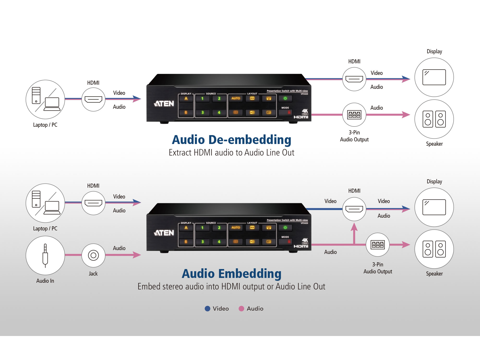 The VP2420 supports versatile audio setups with options for audio embedding or separate extraction. Whether