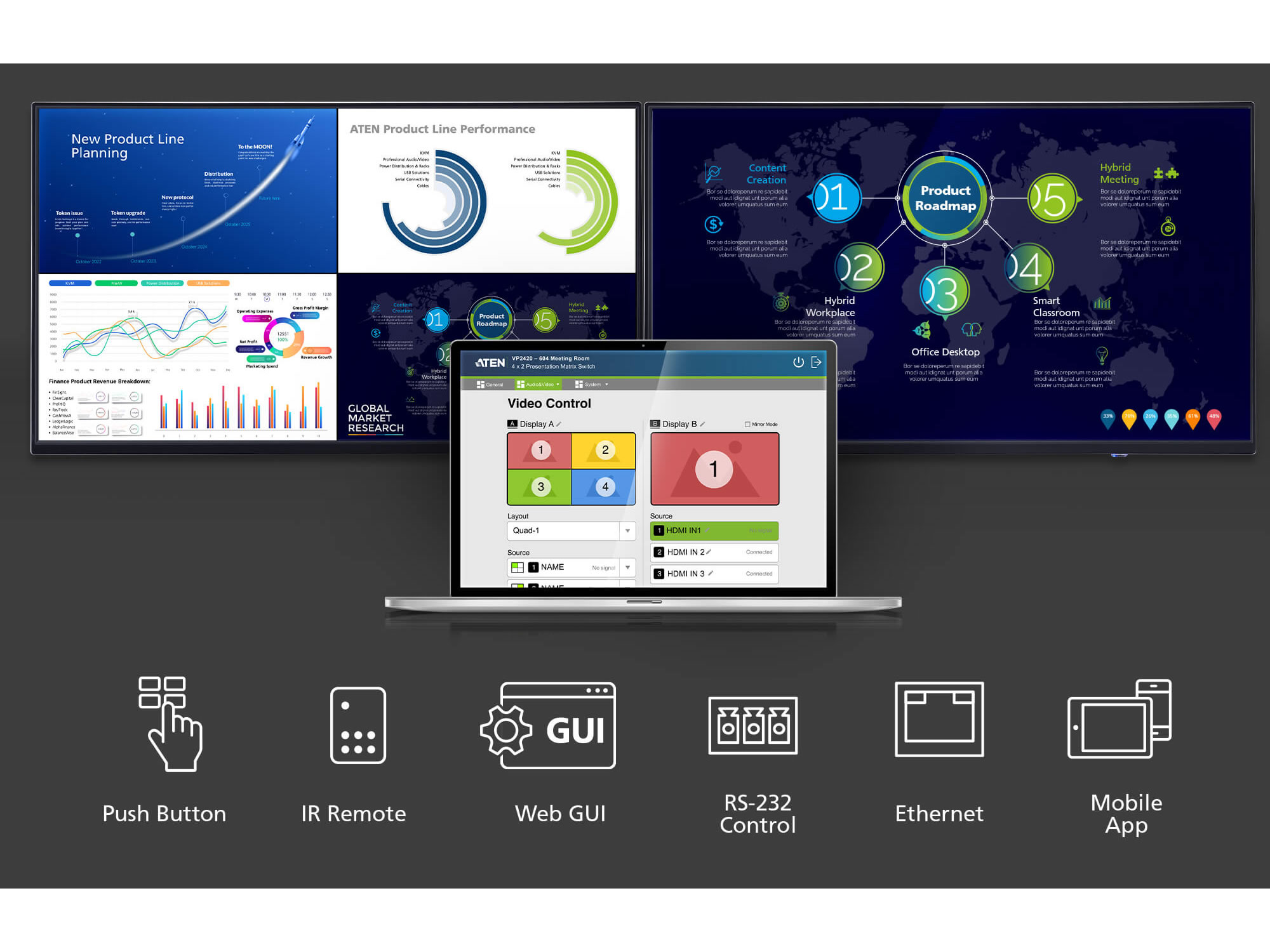 - Multiple control options – front-panel pushbuttons, RS-232, IR, Telnet, Web GUI, and ATEN Video Presentation Control mobile app