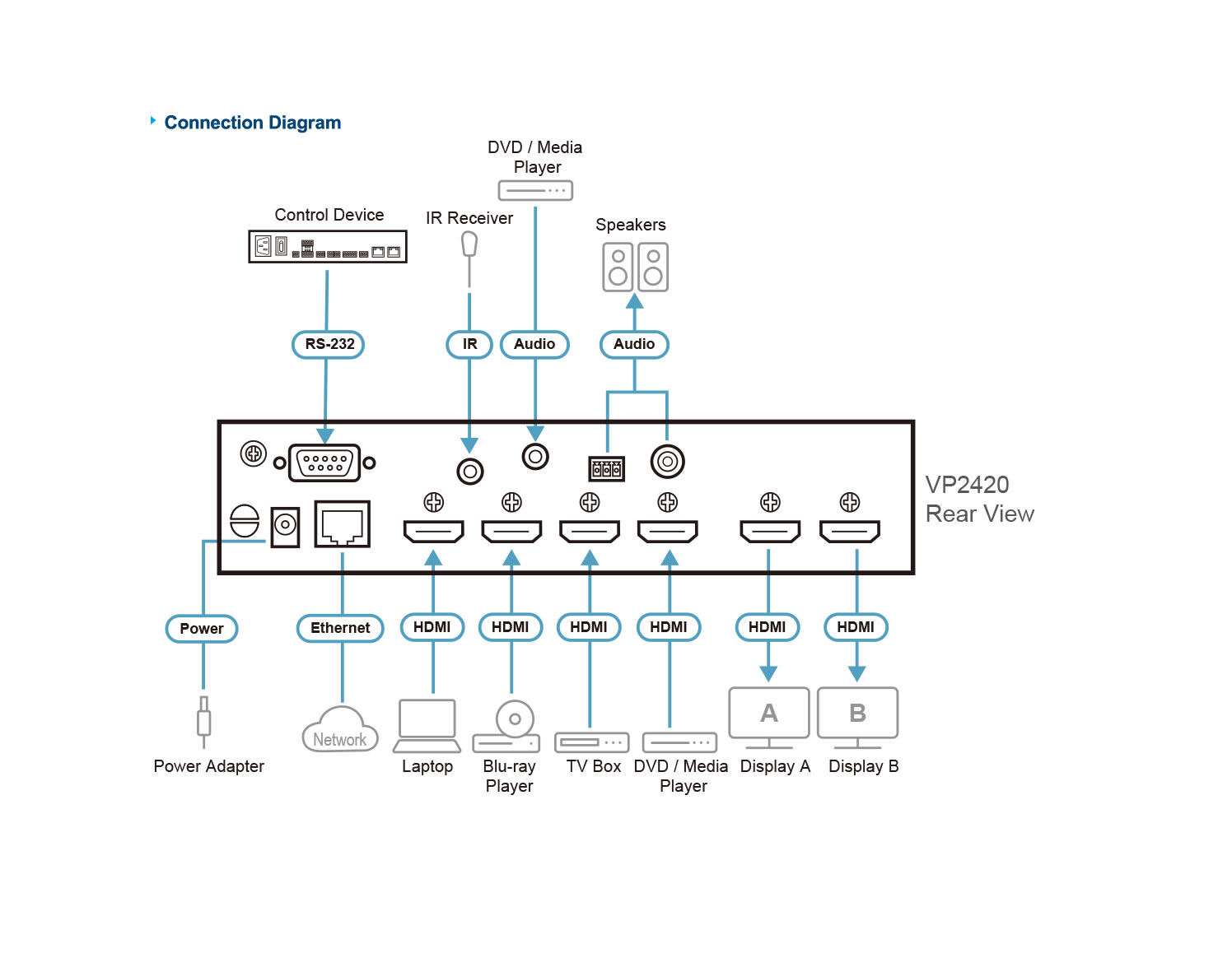 - Can be cascaded up to 2 levels by connecting additional 4 VP2420 units, supporting up to 16 video sources displayed simultaneously