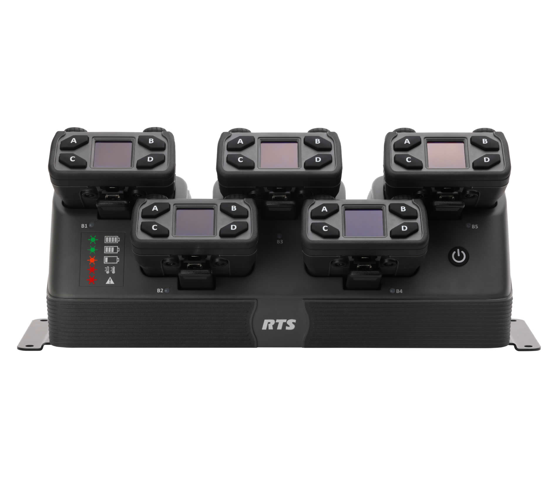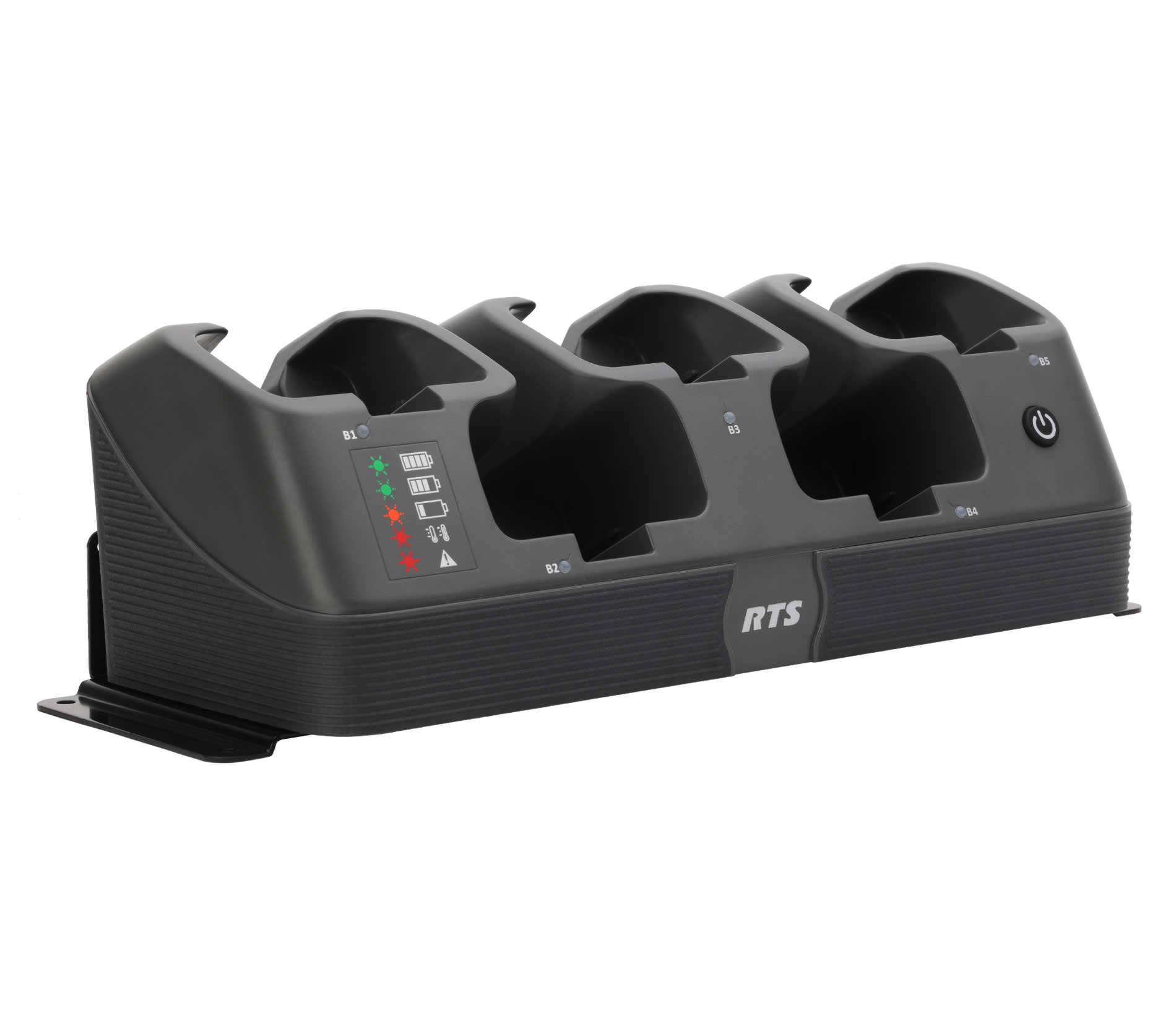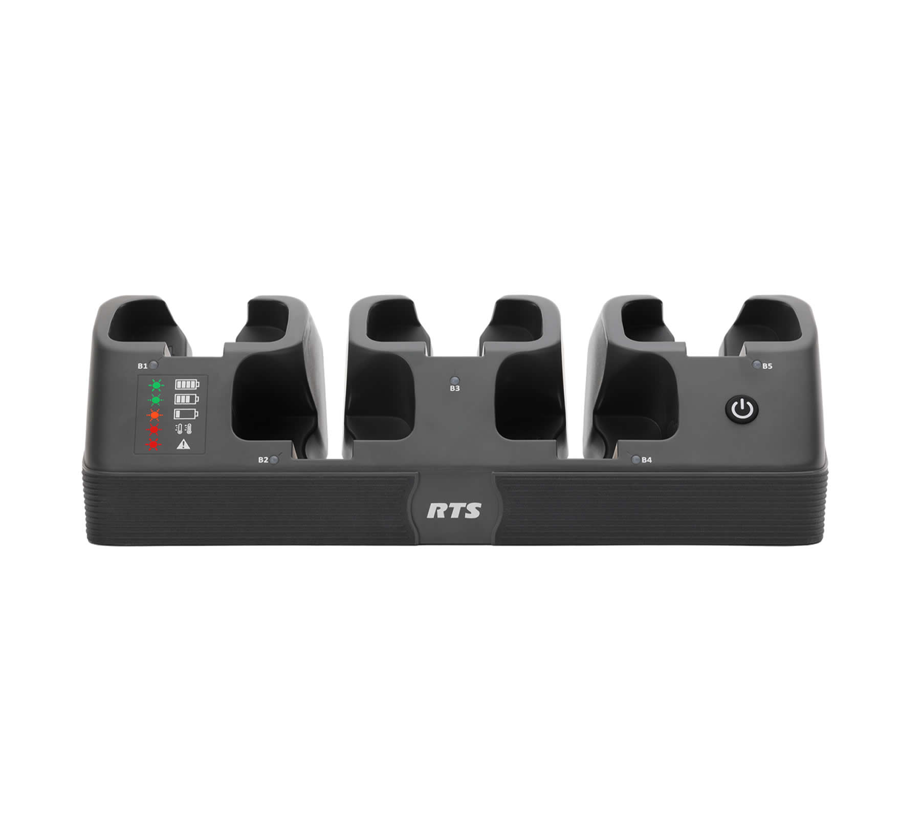 The CB-1000 provides users with a full-featured intelligent charger specifically designed to charge TR-1000 beltpacks and batteries. The CB-1000 offers status indicators and rapid charge capability. The CB-1000 also offers “Intelligent Charging” optimizing the batterycharge cycle and maintaining the battery pack at peak capacity for extended periods of time. Finally, the CB-1000 allows the ability to charge beltpacks without removing headsets or disabling the DECT radio