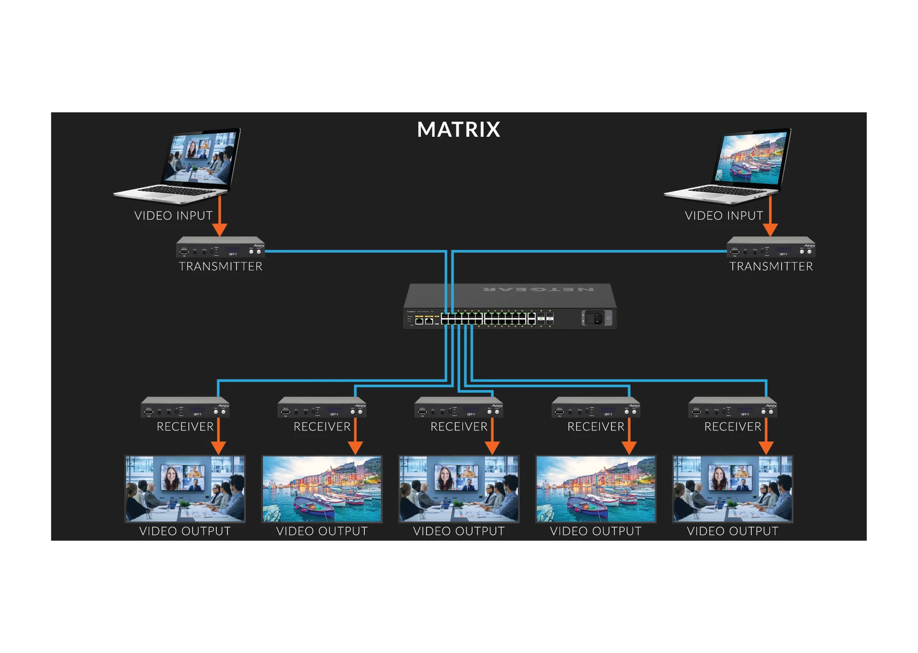 The IBT Series is meant to only use a network switch as a matrix to “glue” the IBT devices together that is on our list of recommend switches so it will work out of the box with little setup for plug and play operation.