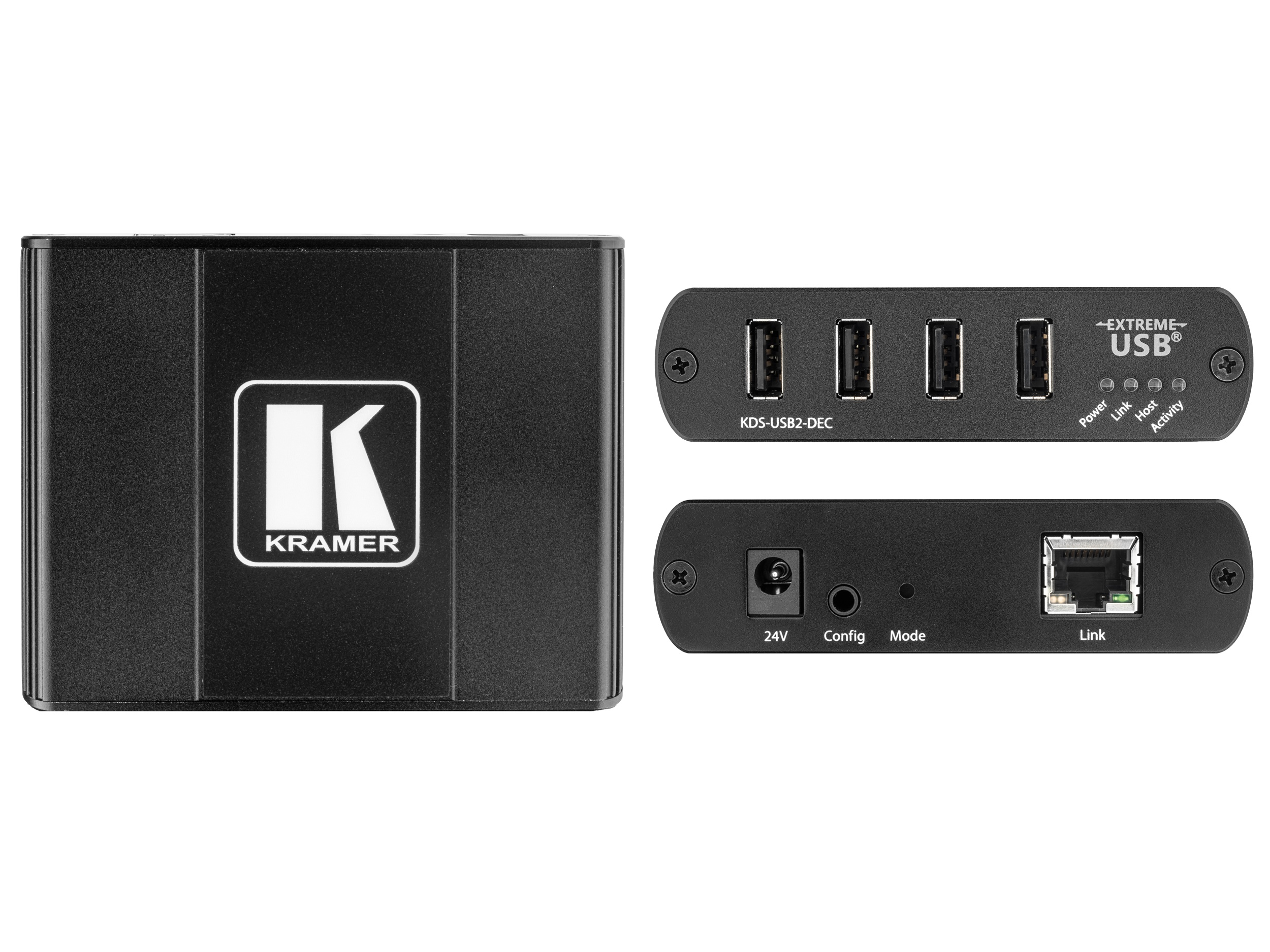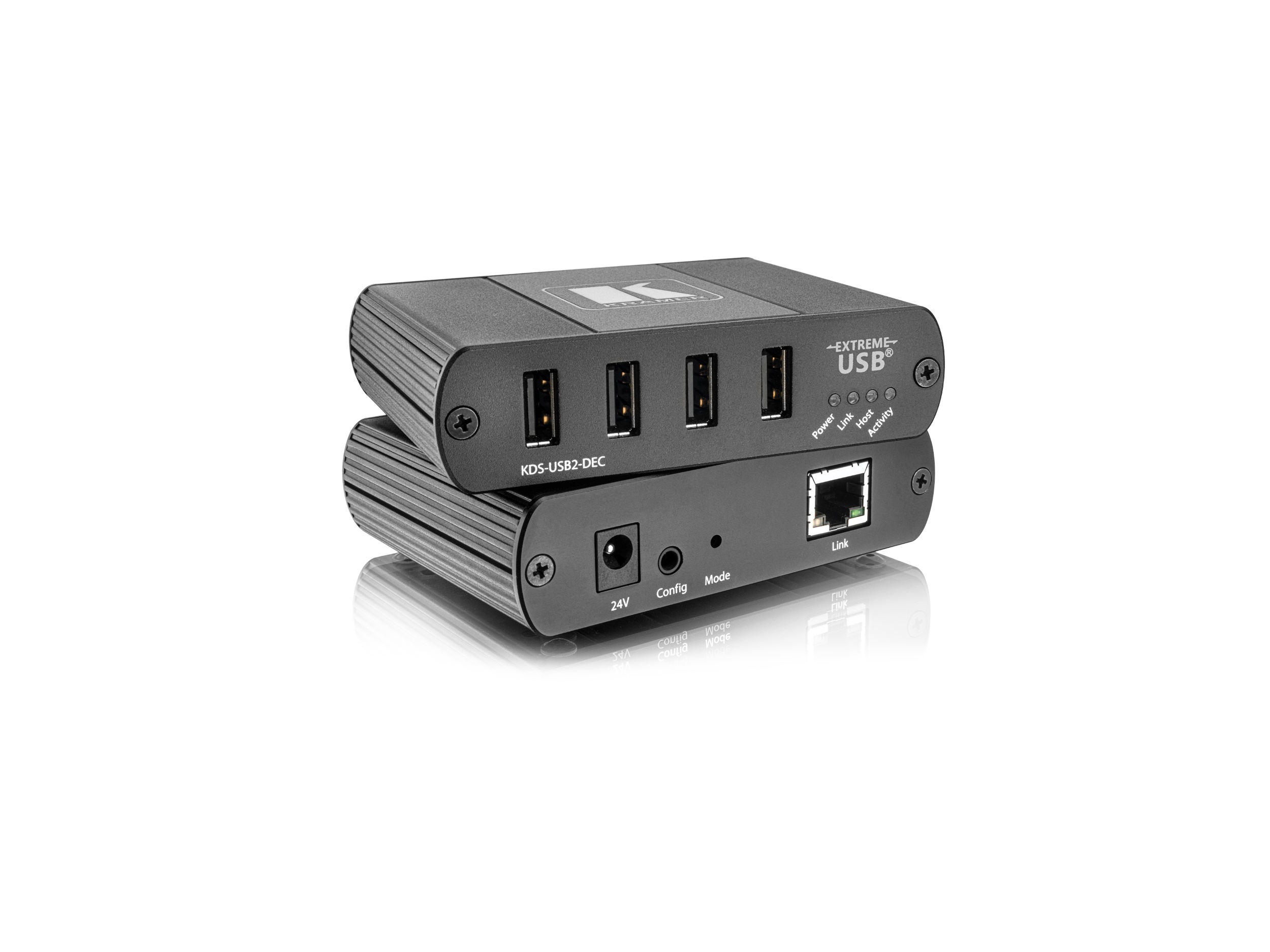 KDS-USB2-DEC is a USB 2.0 high-speed decoder for extending USB signals between a host computer and any USB peripheral device such as a mouse, keyboard, display, camera, mobile device, media player, or hard drive. Connect up to 4 USB devices to KDS-USB2-DEC to enable communication with the host computer connected to a KDS-USB2-EN encoder (sold separately).