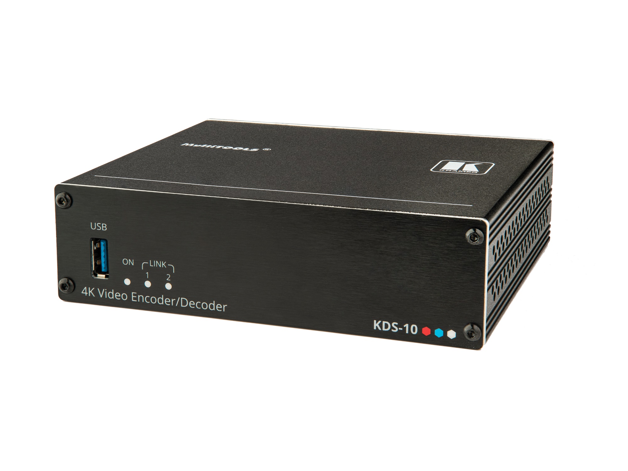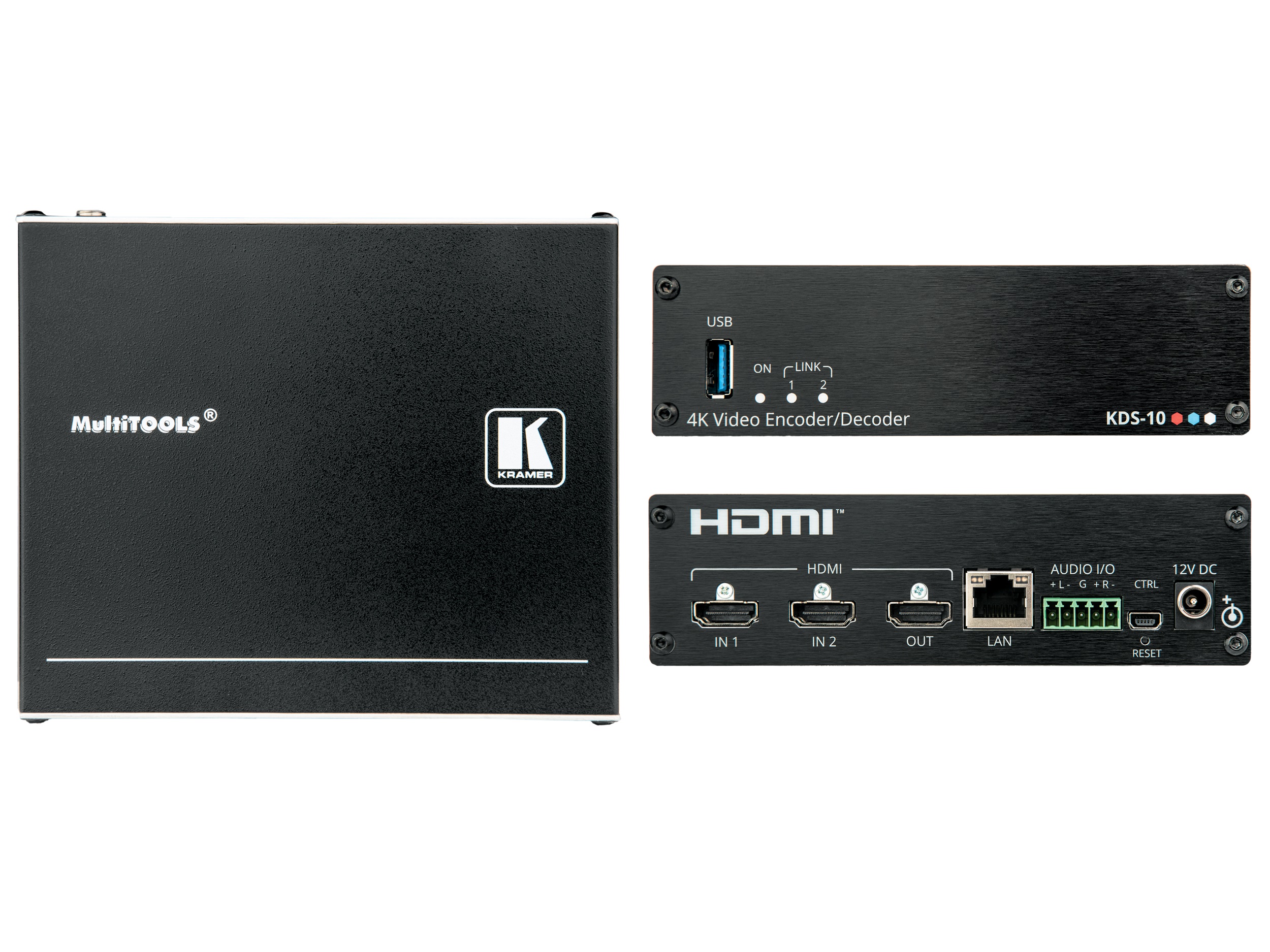 KDS-10 is an advanced, multi-standard transceiver for streaming 4K@60Hz (4:4:4) video signals via Ethernet over copper cable. KDS-10 can be set as either an encoder or decoder. As an encoder, it encodes and streams one or two HDMI inputs over an IP network. As a decoder, it receives the encoded signal, decodes it and outputs it to an HDMI output.