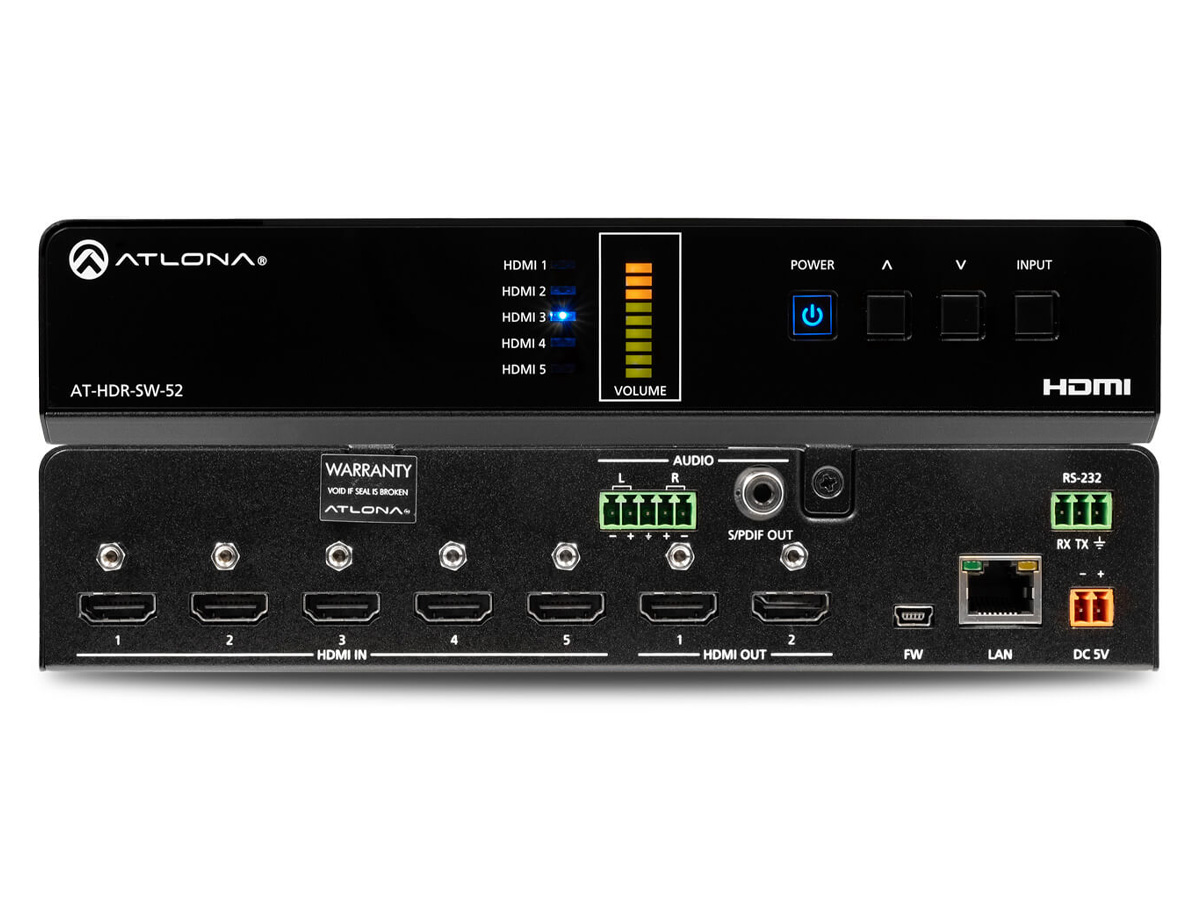 The Atlona AT-HDR-SW-52 is a 5×2 HDMI matrix switcher built to manage multiple 4K HDR sources and dual HDMI displays. It supports 4K/UHD at 60 Hz with 4:4:4 chroma sampling and HDR formats to preserve high-fidelity image quality. The unit provides selectable mirrored or matrixed outputs to match diverse AV workflows.