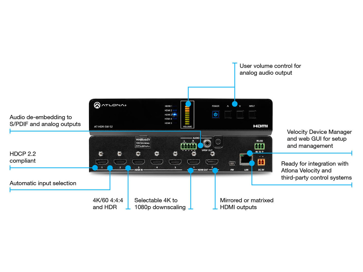 Connectivity includes 5x HDMI Type A inputs, 2x HDMI Type A outputs, balanced analog audio via a 5-pin captive screw, S/PDIF RCA output, RS-232 captive screw port, RJ45 Ethernet for control, IR support, and a mini-USB firmware port. The front panel offers volume buttons and status LEDs, and the device is controllable via TCP/IP, RS-232, IR, or Atlona Velocity systems. Firmware is field updatable through the web GUI or Velocity Device Manager.